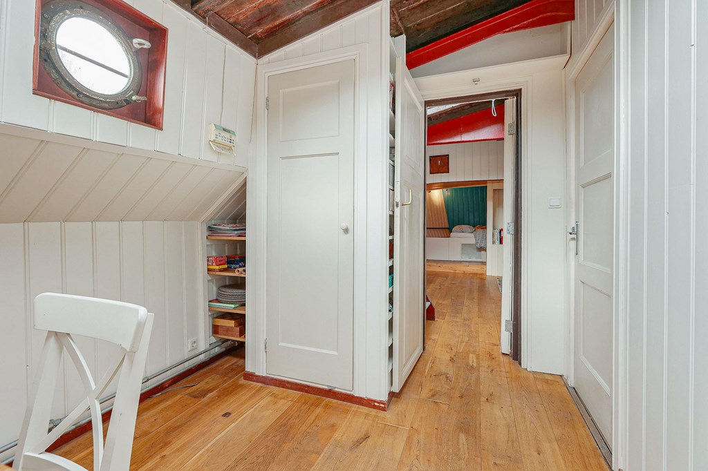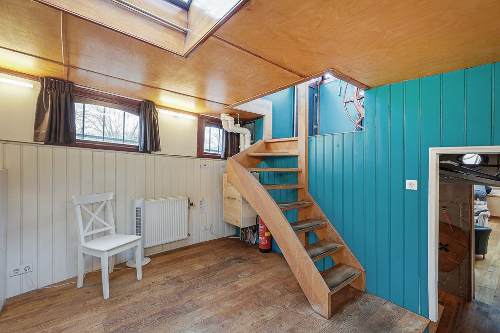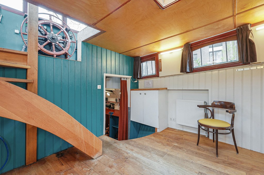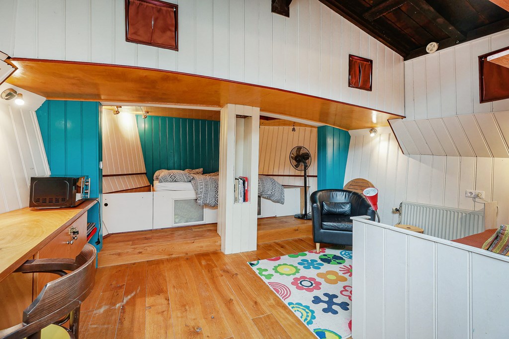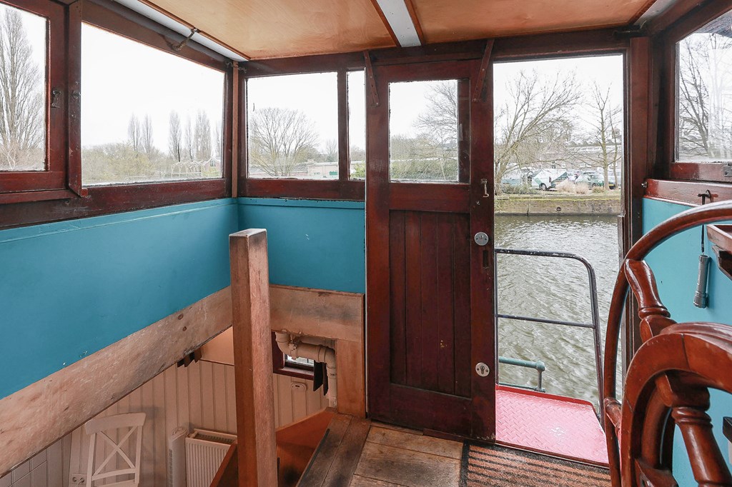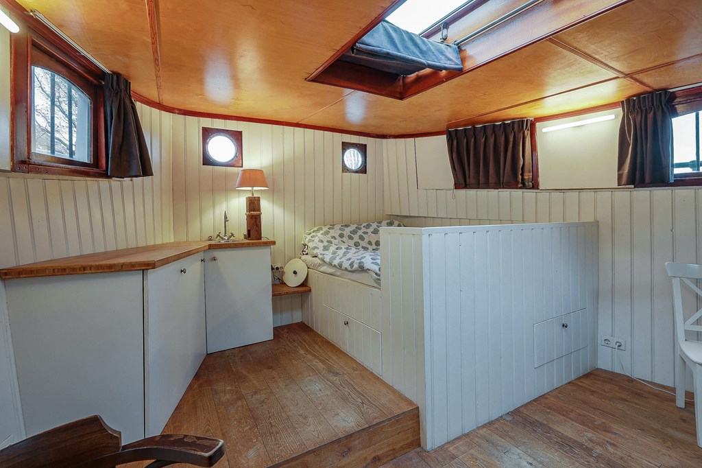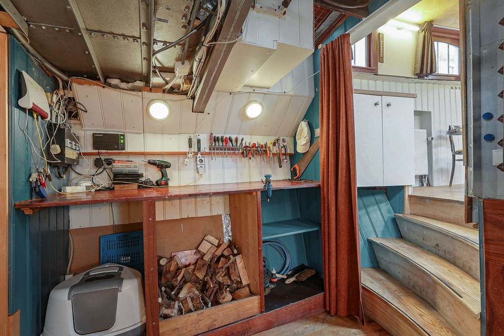 Via een loopplank komt u bij de entree in de stuurhut, trap naar beneden met links de slaapkamer en rechts via een kleine trap komt u in de voormalige machine kamer die nu wordt gebruikt als werkruimte. Woonkamer met houtkachel en open keuken voorzien van diverse inbouwapparatuur, bijkeuken, badkamer met douche en wastafel, aparte toiletruimte. In het voorschip bevindt zich momenteel de B&B met een zitgedeelte met vaste bank en twee slaapruimtes met vast 2-persoonsbed, badkamer met douche toilet en wastafel. De B&B heeft een aparte ingang via een luik en trap. In het gehele schip ligt een lichte houten vloer, zijn er veel authentieke details als de patrijspoorten en het houten plafond met stalen dwarsbalken en door het gebruik van daklichten is er veel lichtinval.