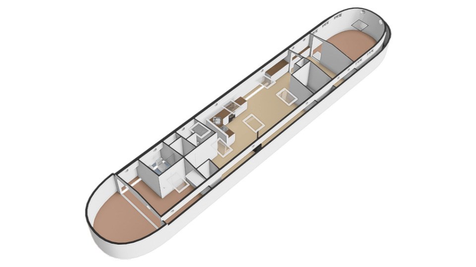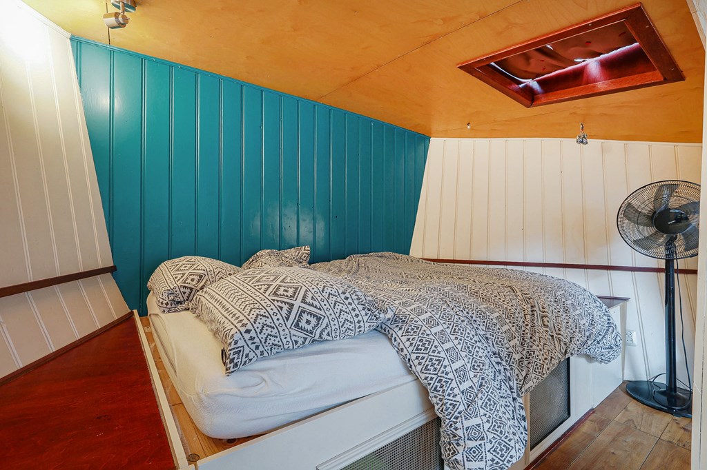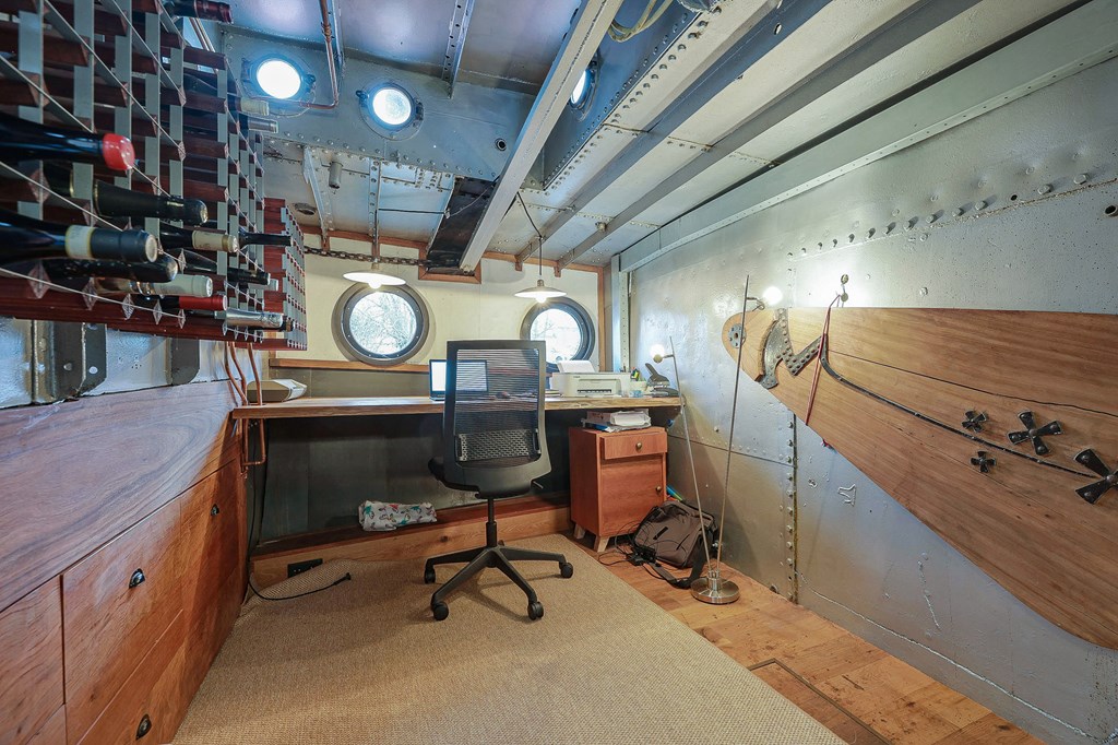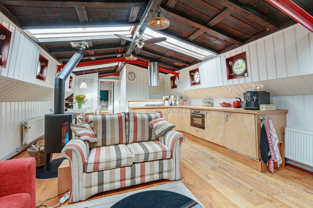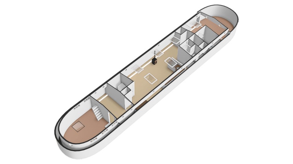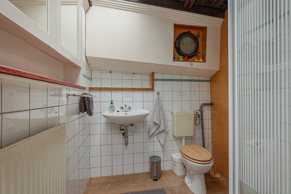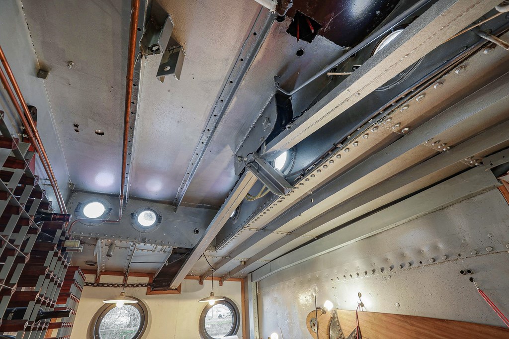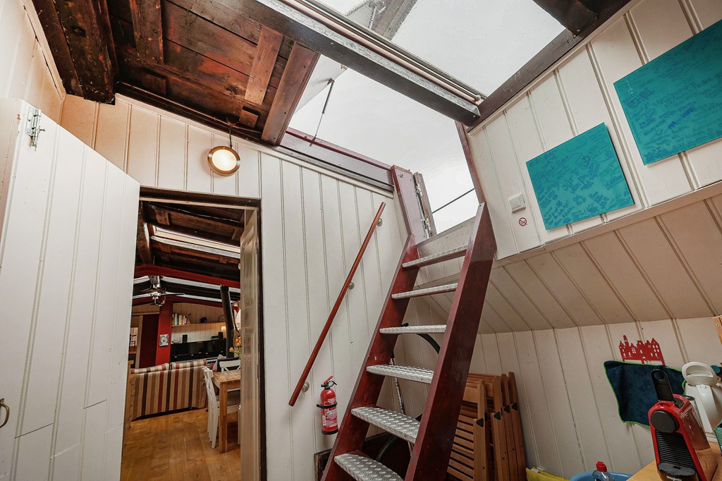 Via een loopplank komt u bij de entree in de stuurhut, trap naar beneden met links de slaapkamer en rechts via een kleine trap komt u in de voormalige machine kamer die nu wordt gebruikt als werkruimte. Woonkamer met houtkachel en open keuken voorzien van diverse inbouwapparatuur, bijkeuken, badkamer met douche en wastafel, aparte toiletruimte. In het voorschip bevindt zich momenteel de B&B met een zitgedeelte met vaste bank en twee slaapruimtes met vast 2-persoonsbed, badkamer met douche toilet en wastafel. De B&B heeft een aparte ingang via een luik en trap. In het gehele schip ligt een lichte houten vloer, zijn er veel authentieke details als de patrijspoorten en het houten plafond met stalen dwarsbalken en door het gebruik van daklichten is er veel lichtinval.