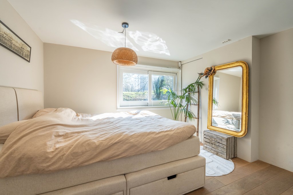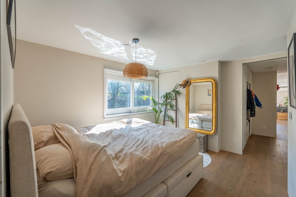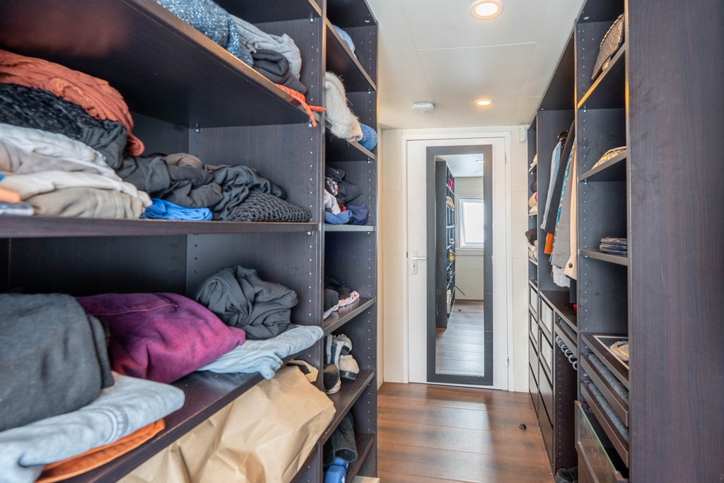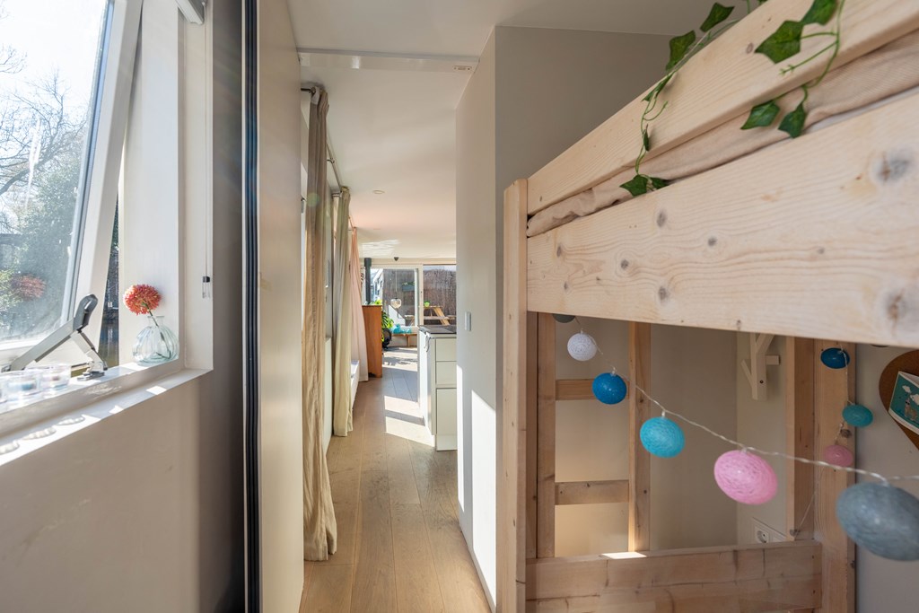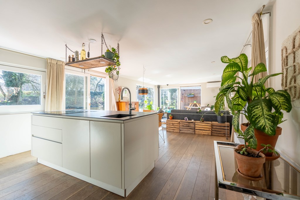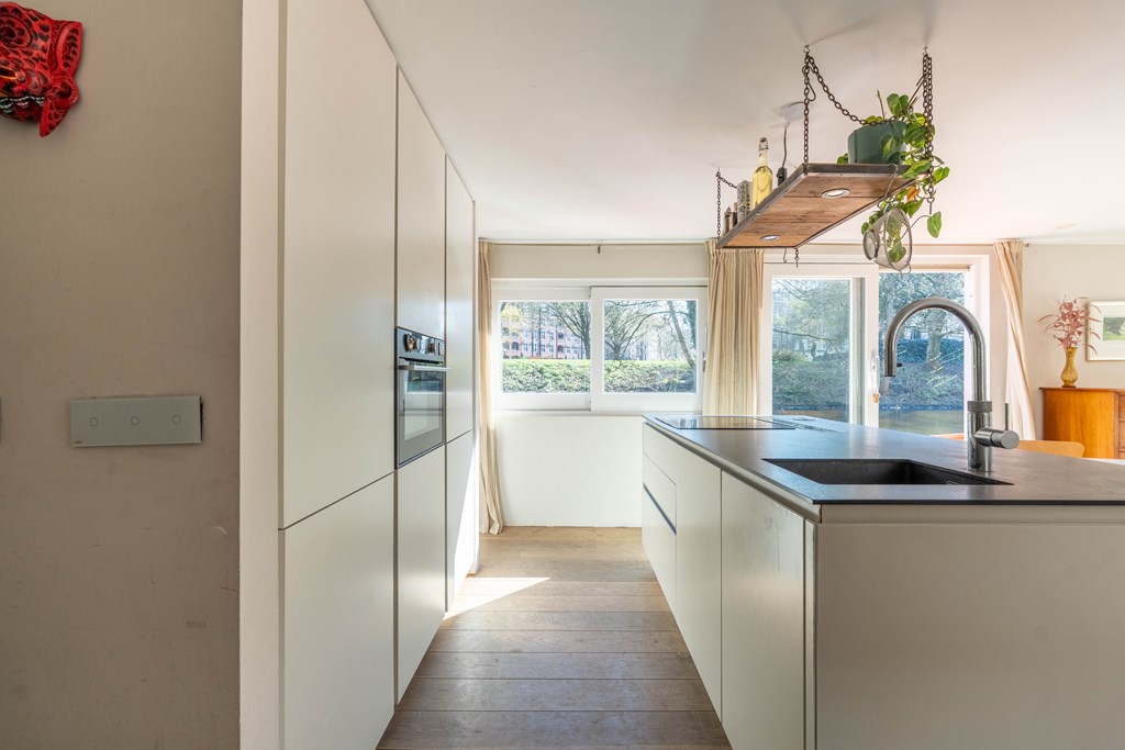 Vanaf de kade komt u binnen in de hal, die in open verbinding staat met de lichte woonkamer voorzien van grote kunststof schuiframen en een stoere houtkachel. In de eigentijdse open keuken met inbouwapparatuur is een fraai kookeiland gemaakt met spoelbak, Quooker kraan en een kookplaat met geïntegreerde afzuiging. Achter de keuken bevindt zich een werk-/slaapkamer. Vanuit de gang heeft u toegang tot het aparte toilet en de badkamer met royale douche en dubbele wastafel in meubel. Aan de kopse zijde vindt u de grote slaapkamer met kasten en in de overbouw een inloopkast.