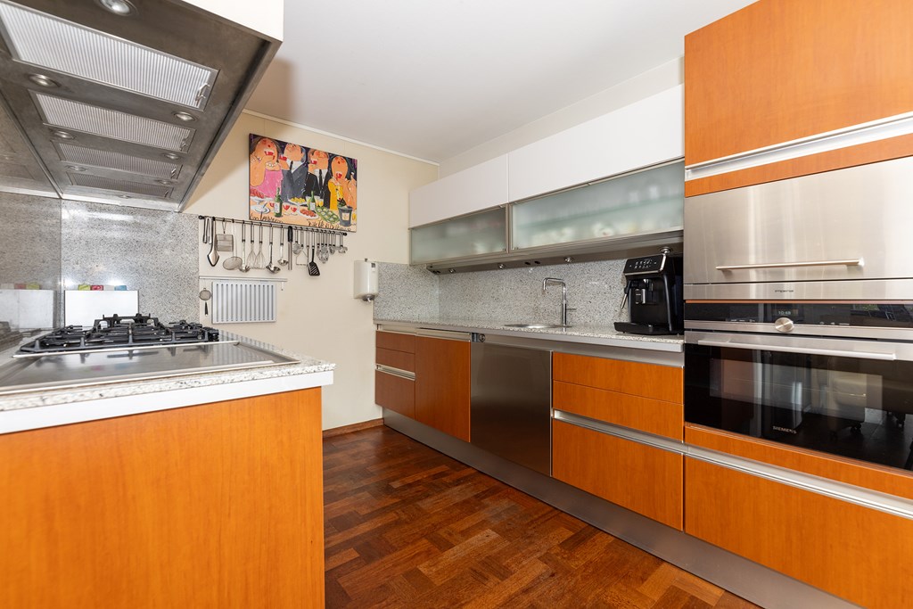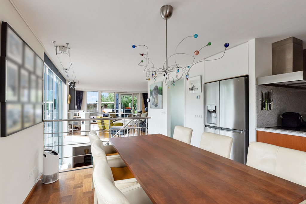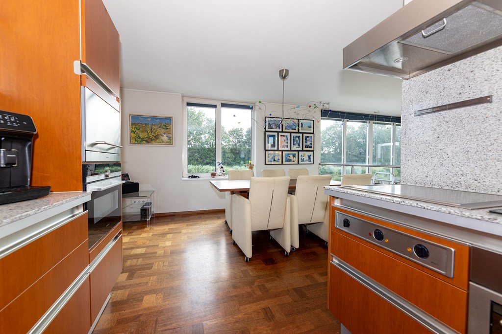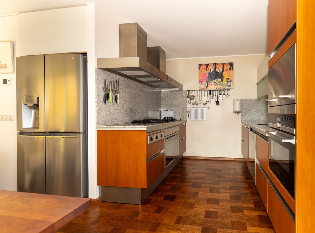 De royale woonkeuken is van alle gemakken voorzien en ingericht voor de kookliefhebber met een breed scala aan luxe inbouwapparatuur, alles strak en modern uitgevoerd.