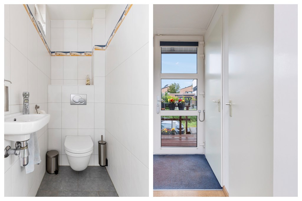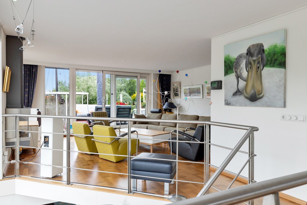 Via de overdekte entree kom je in een ruime hal met garderobe en separaat gastentoilet. De indrukwekkende vide met enorme raampartijen biedt direct zicht op het water en laat volop daglicht binnenstromen. De woonkamer is voorzien van een sfeervolle gashaard en schuifpuien naar het zonnige terras – een heerlijke plek om te ontspannen of te barbecueën met uitzicht op het water.