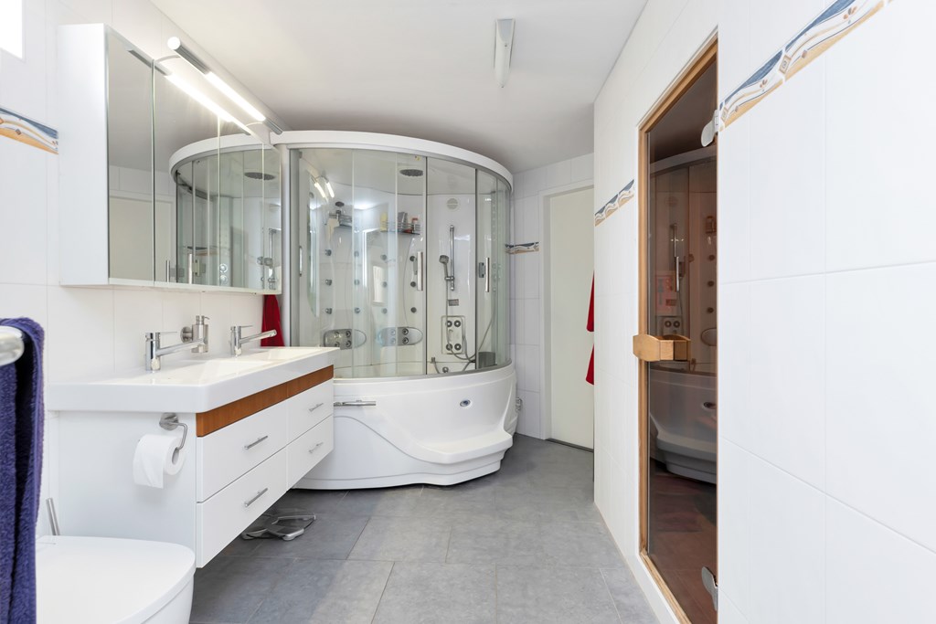 De ruime en lichte overloop biedt toegang tot de master bedroom met directe doorgang naar een kamer/werkplek met veel kastruimte en een luxe uitgevoerde badkamer inclusief sauna.