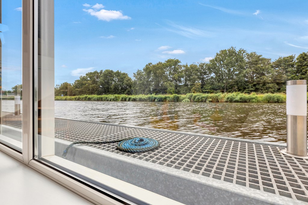 Buitenom is de villa voorzien van een brede omlooprand waar een boot kan worden afgemeerd. Via het boven terras bereik je een lager houten terras met zwemtrap – ideaal voor zomerse dagen – en toegang tot het boothuis. De watervilla is professioneel afgemeerd aan drie stevige dukdalven en is afgewerkt met onderhoudsarme gevelmaterialen.