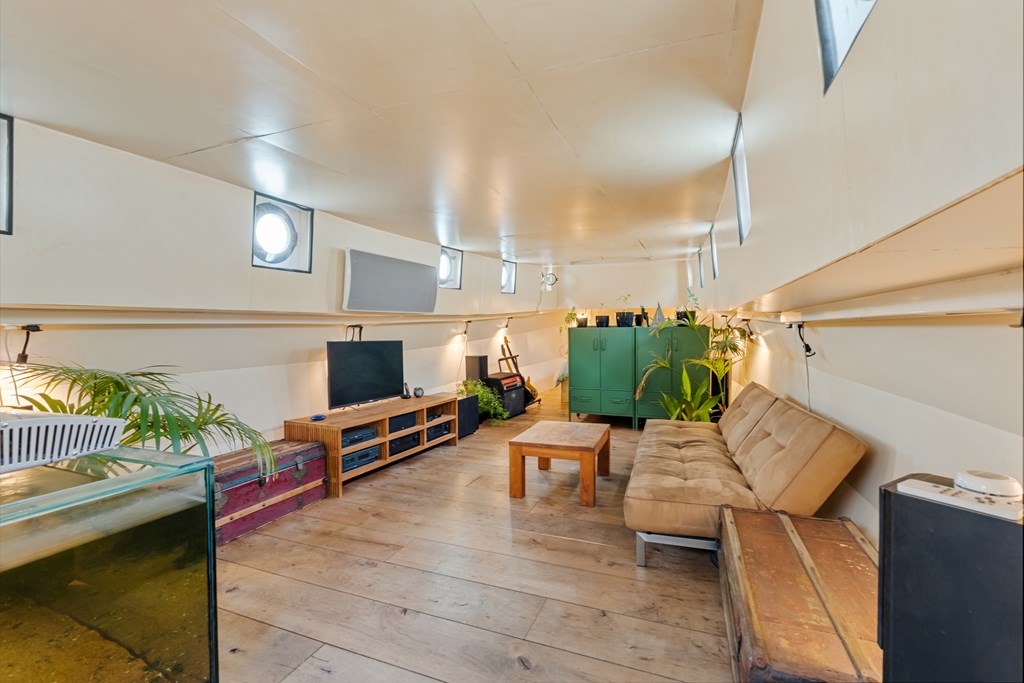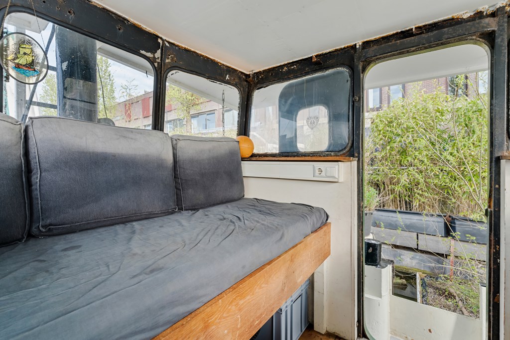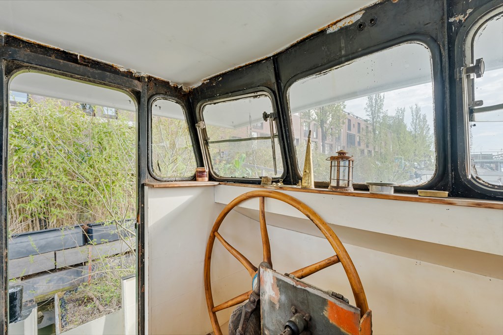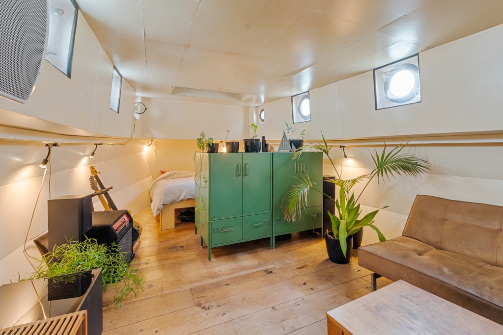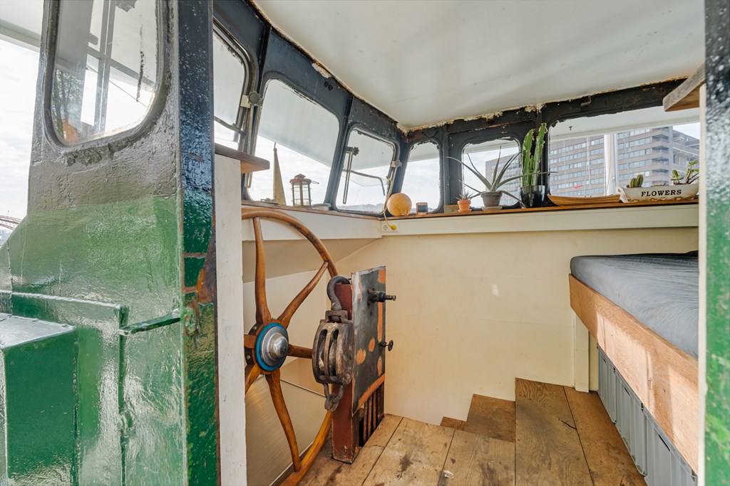 De entree bevindt zich in de stuurhut met vaste bank, via een trap naar beneden komt u in het leefgedeelte, hier bevinden zich de woonkamer, strakke open keuken en voorin de slaapruimte. Er is veel lichtinval door de patrijspoorten rondom en het grote daklicht. De houtenvloer met brede planken geeft het geheel een stoere uitstraling. In het achterschip ligt de badkamer met douche in bad, wastafelmeubel, toilet en de wasmachine aansluiting. Er is nog een voormalige machinekamer aanwezig van ± 10m² welke omgetoverd zou kunnen worden als extra slaapkamer.