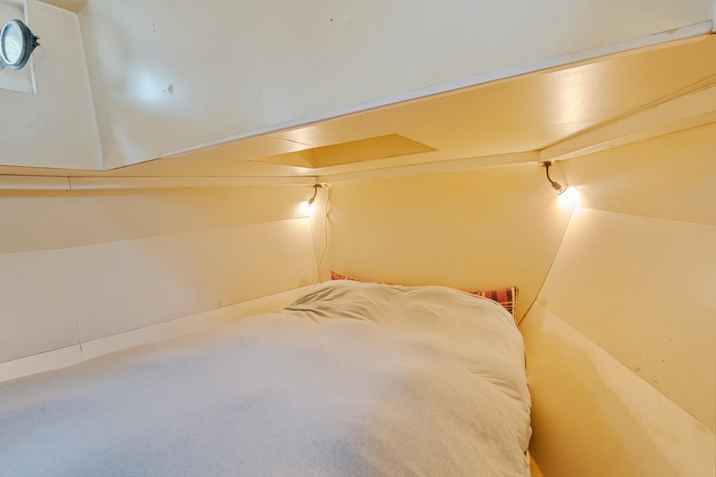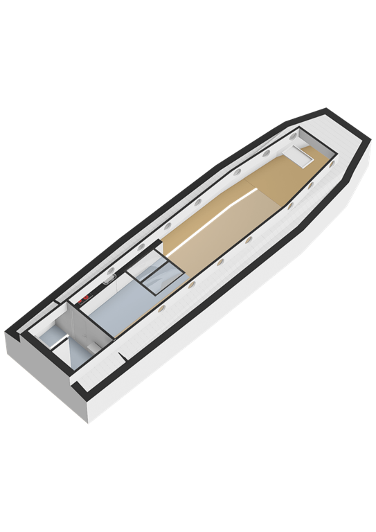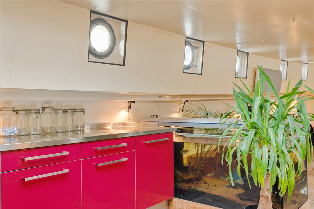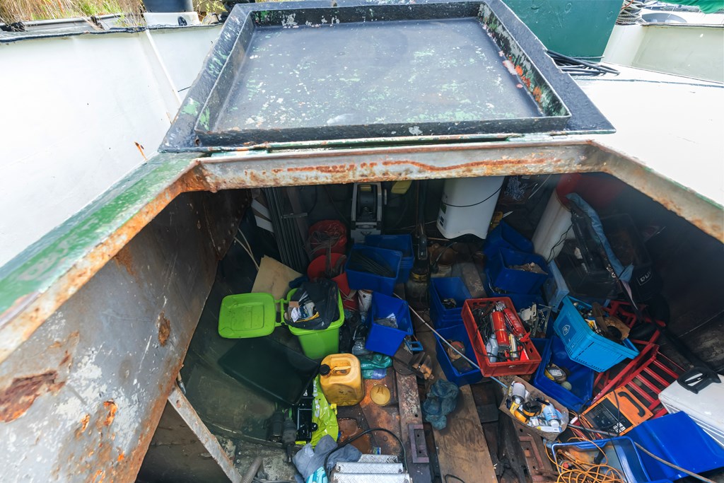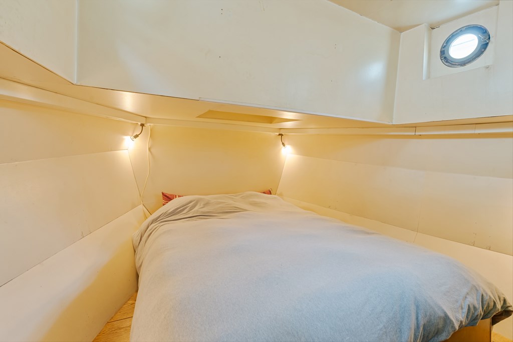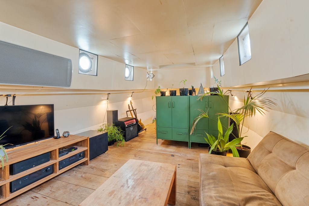 De entree bevindt zich in de stuurhut met vaste bank, via een trap naar beneden komt u in het leefgedeelte, hier bevinden zich de woonkamer, strakke open keuken en voorin de slaapruimte. Er is veel lichtinval door de patrijspoorten rondom en het grote daklicht. De houtenvloer met brede planken geeft het geheel een stoere uitstraling. In het achterschip ligt de badkamer met douche in bad, wastafelmeubel, toilet en de wasmachine aansluiting. Er is nog een voormalige machinekamer aanwezig van ± 10m² welke omgetoverd zou kunnen worden als extra slaapkamer.