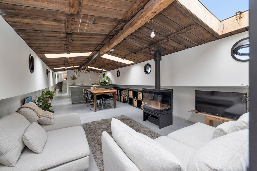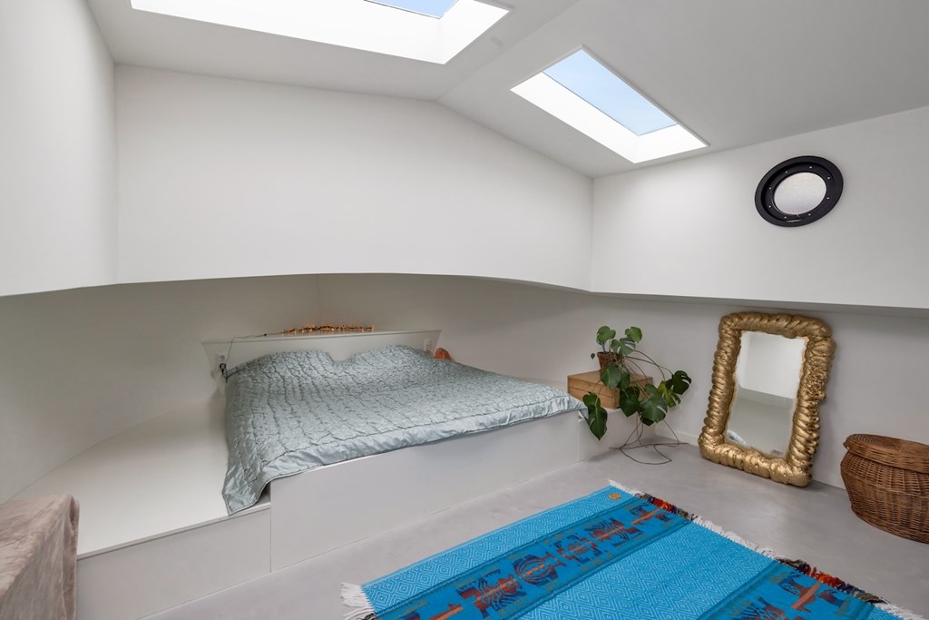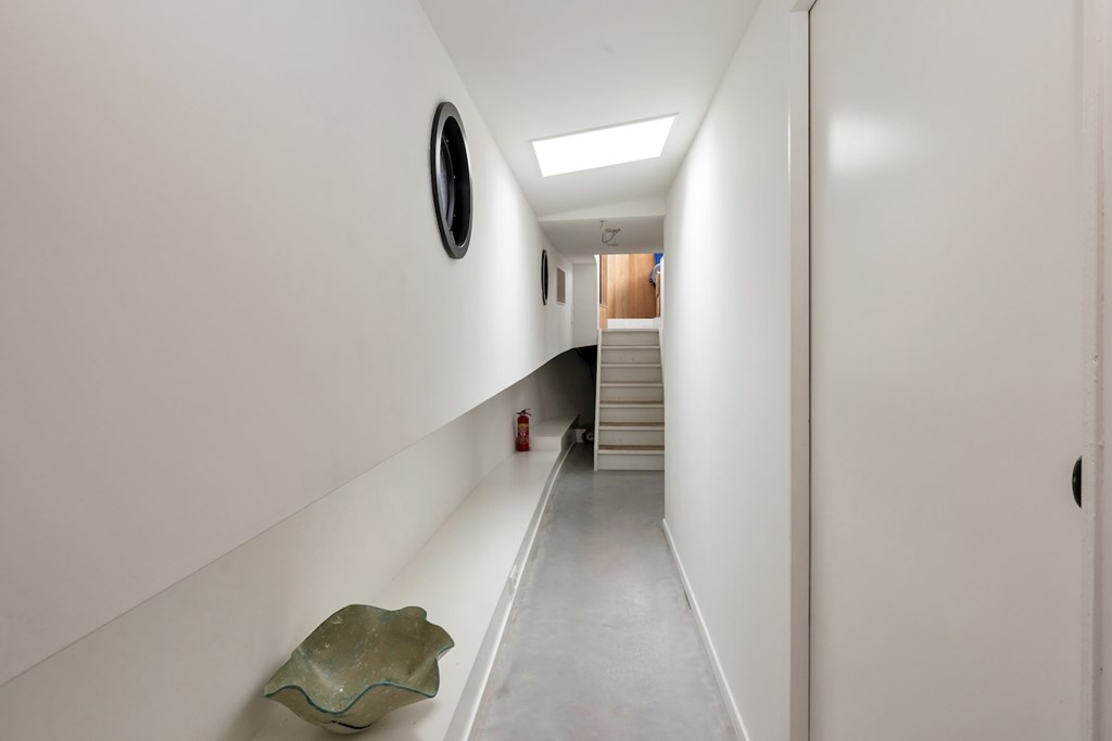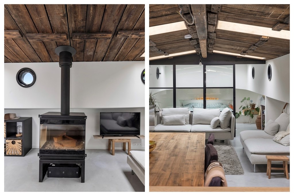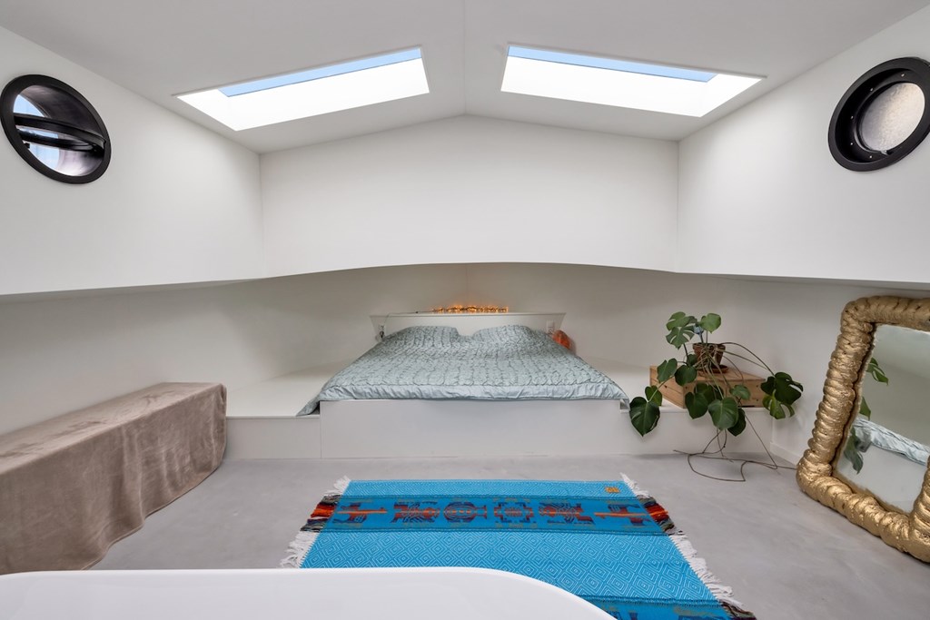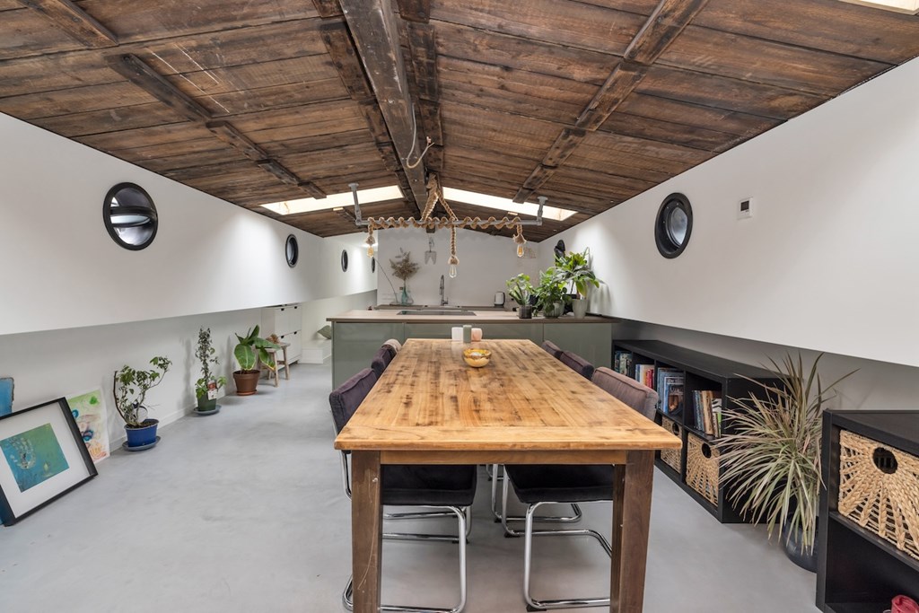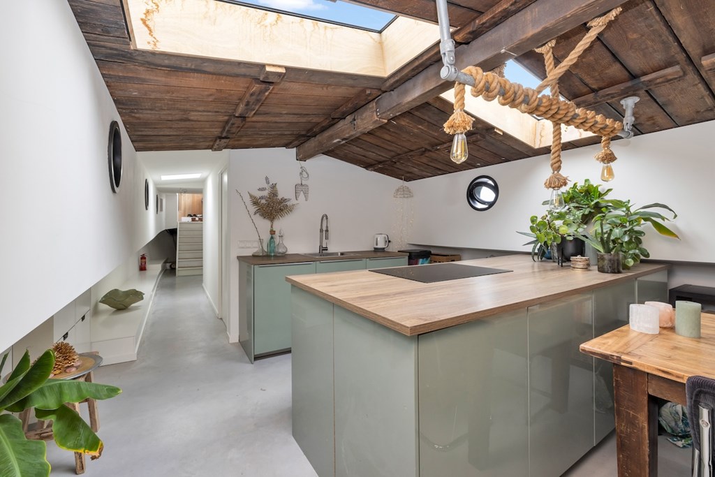 De hele woning is afgewerkt met gevlinderde betonvloeren met vloerverwarming. De plafonds zijn vervaardigd van authentieke oude scheepsluiken, wat het interieur een uniek en karaktervol maritiem accent geeft.