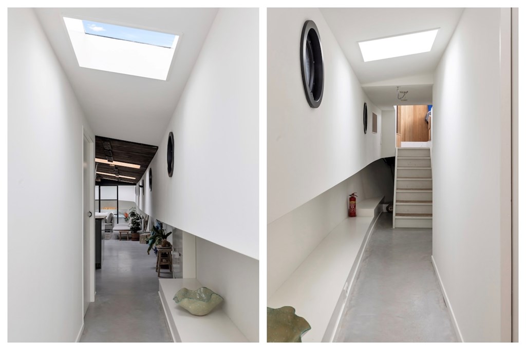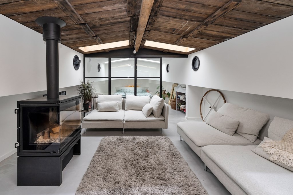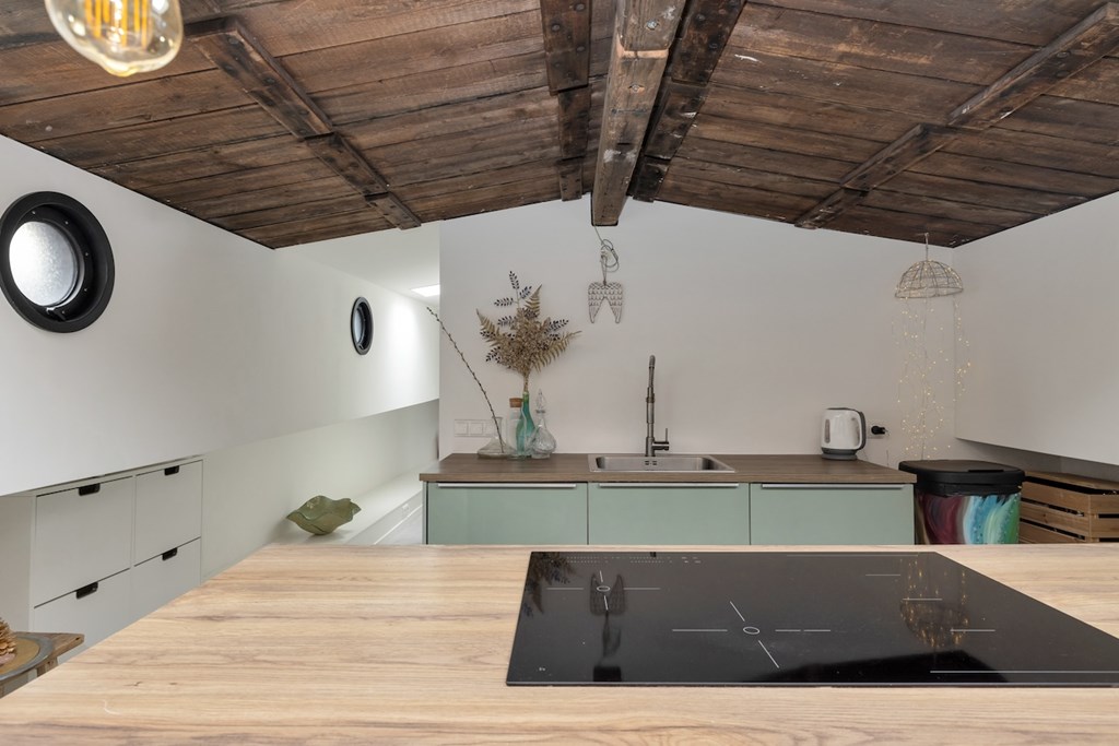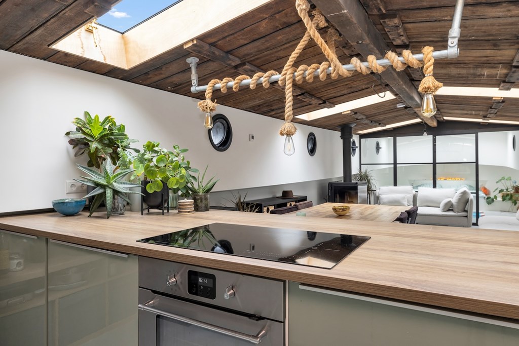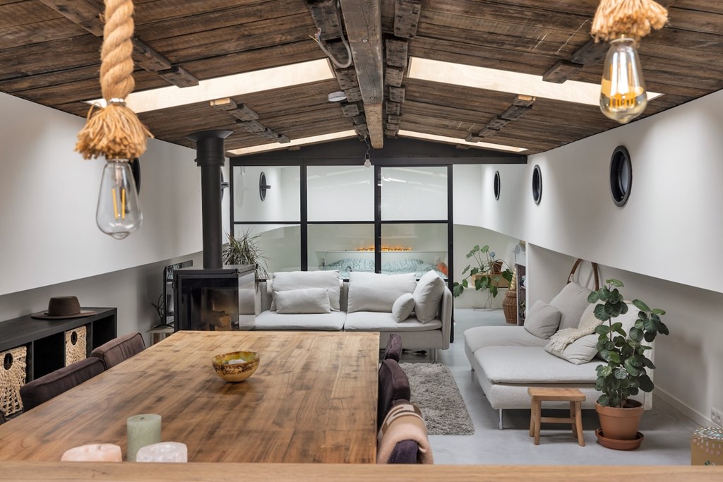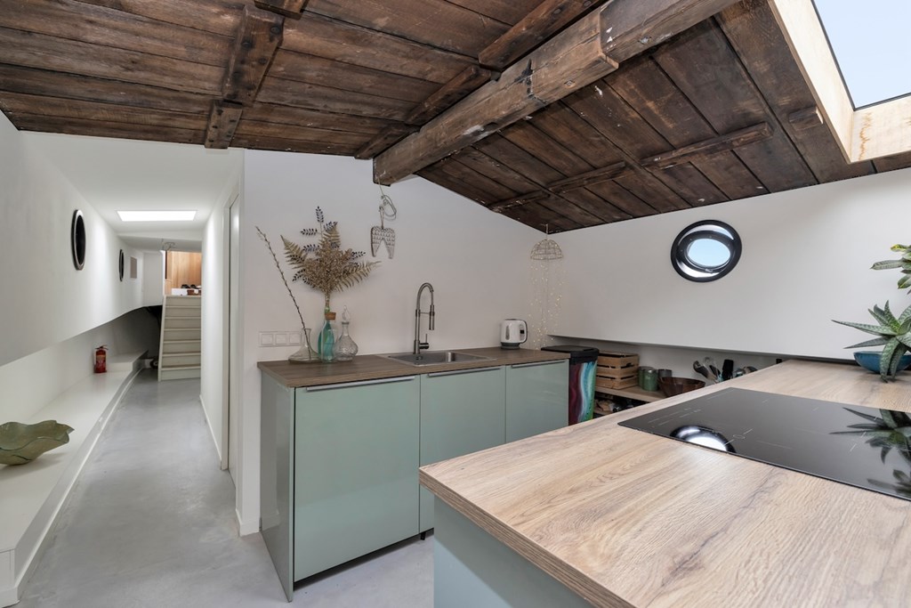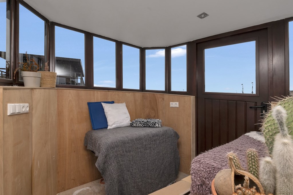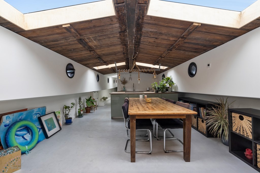 De hele woning is afgewerkt met gevlinderde betonvloeren met vloerverwarming. De plafonds zijn vervaardigd van authentieke oude scheepsluiken, wat het interieur een uniek en karaktervol maritiem accent geeft.