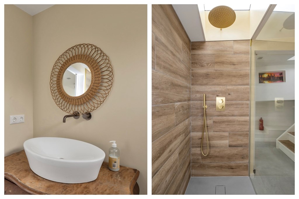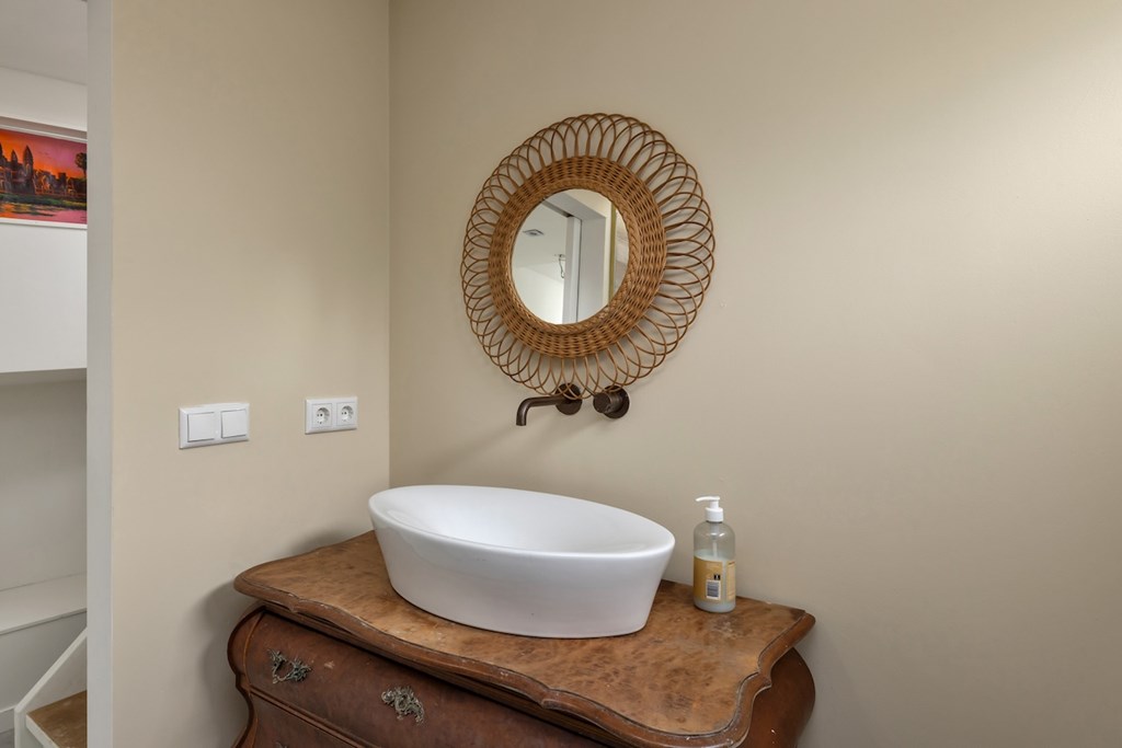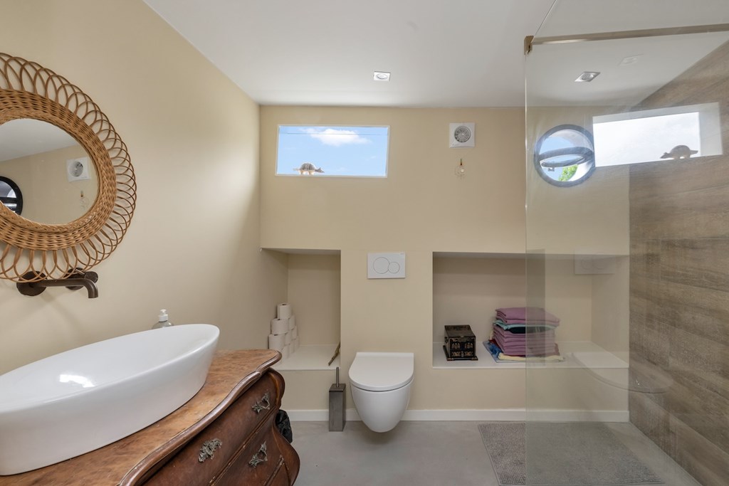 Via de lange gang bereik je een multifunctionele zijkamer met aansluiting voor wasmachine en droger. Deze ruimte biedt volop mogelijkheden voor een inloopkast, grote kastenwand of een tweede slaapkamer. Daarnaast is er een moderne badkamer met inloopdouche, toilet en een grote wastafel op een antiek meubelstuk.
