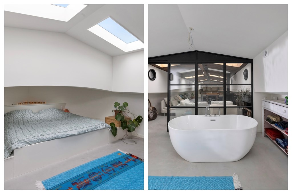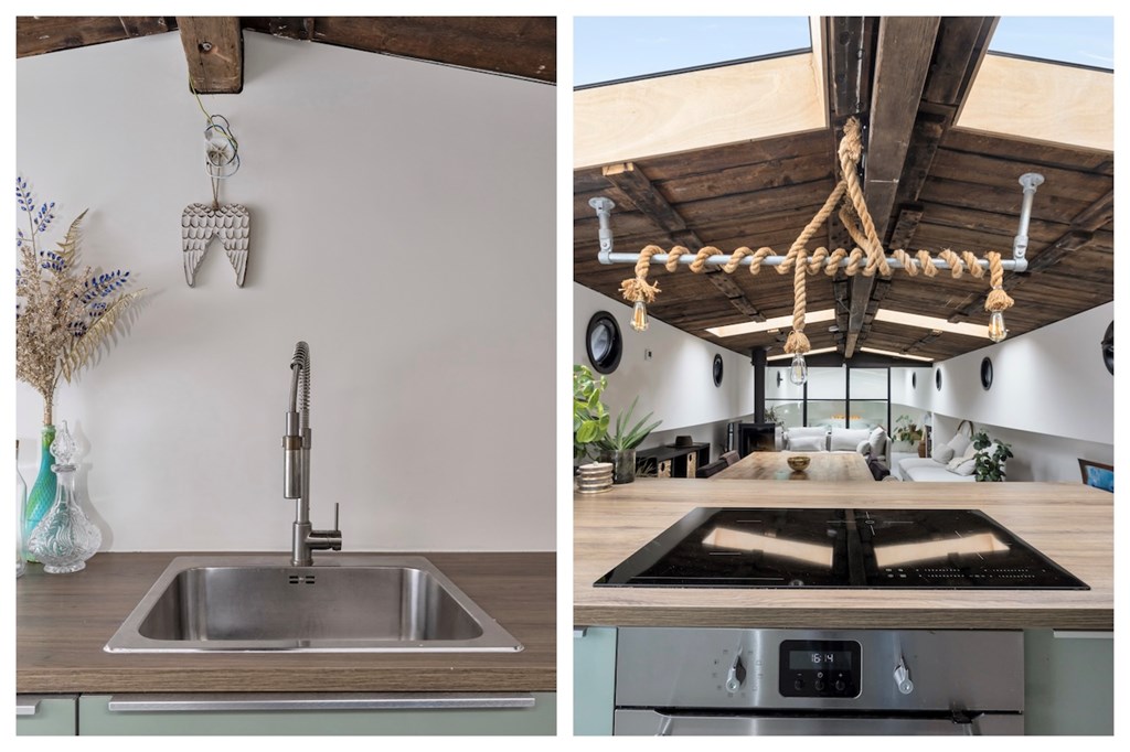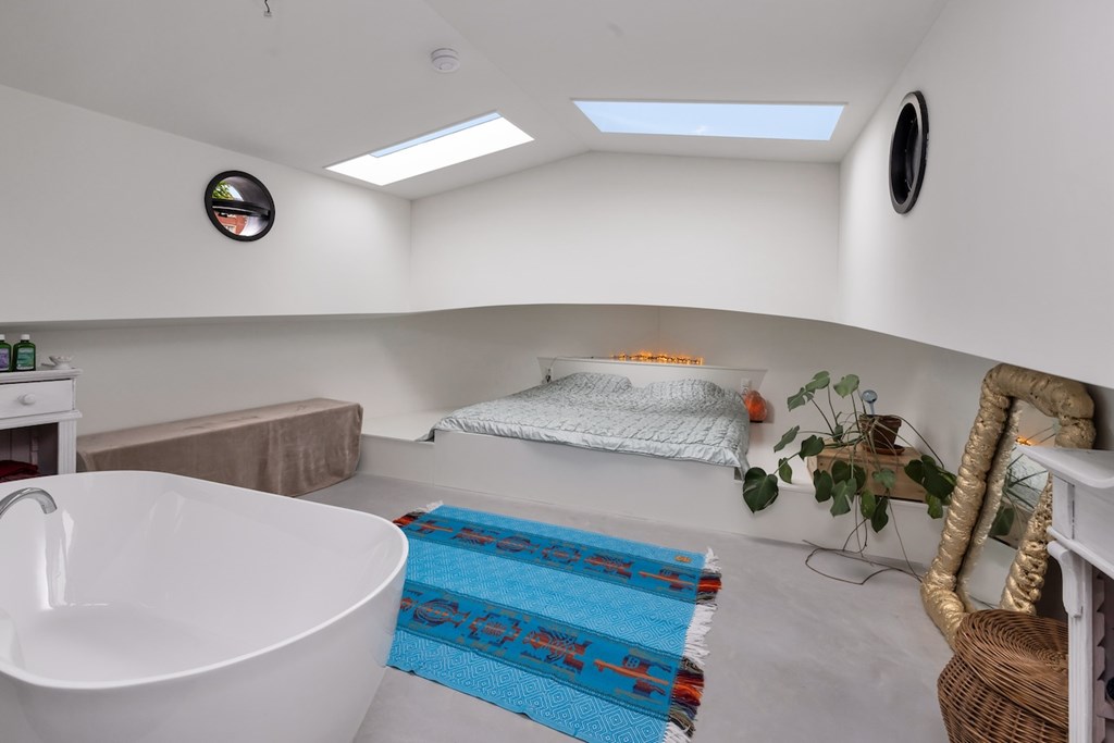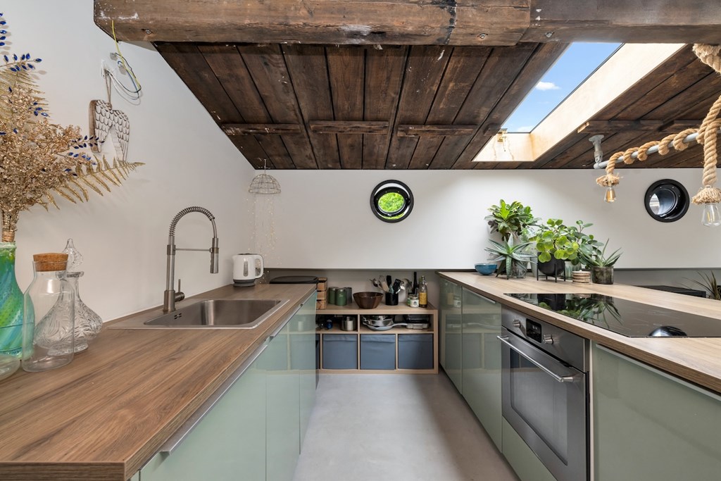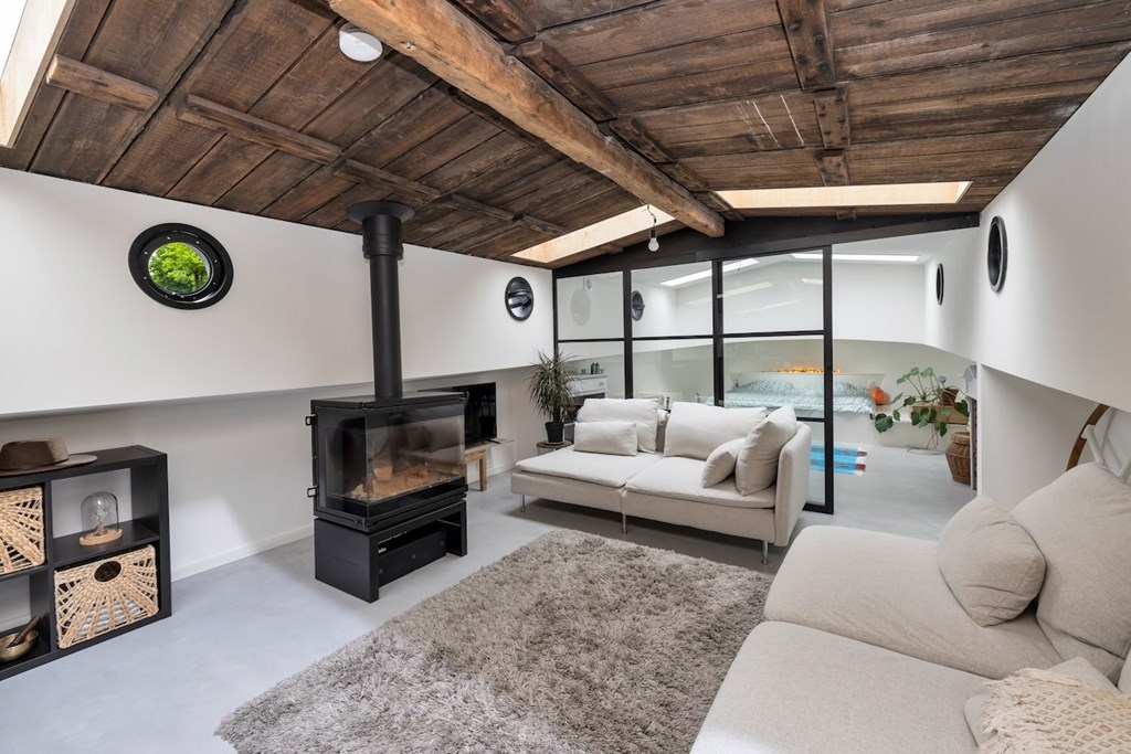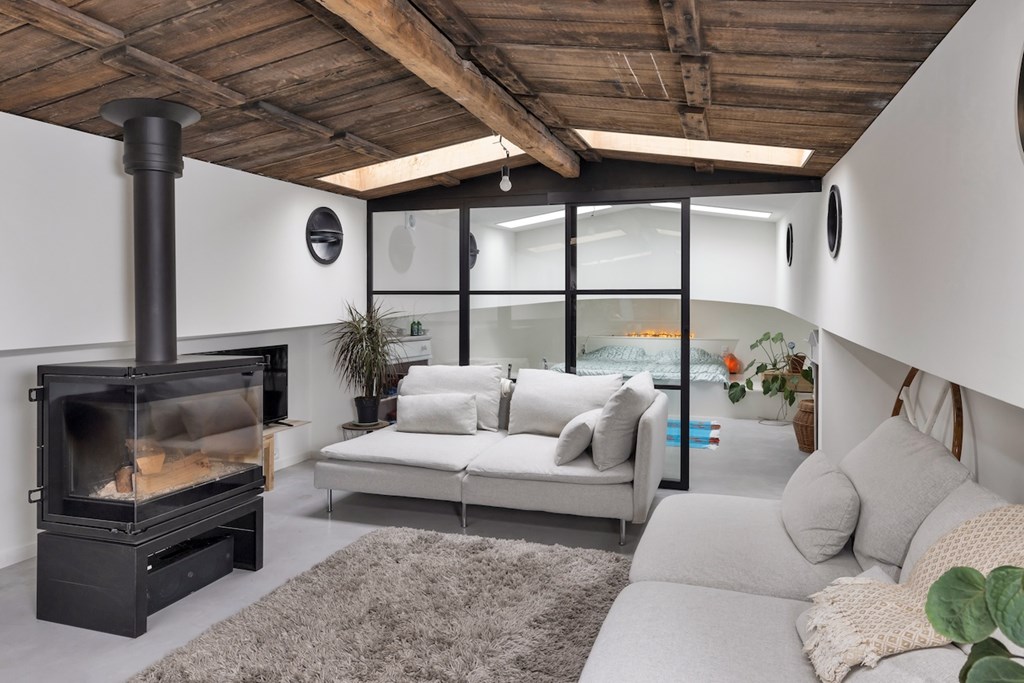 In het voorschip bevindt zich een royale slaapkamer met een vrijstaand ligbad, gescheiden van de woonkamer door een stijlvolle metalen glaswand. De ruime, lichte woonkamer beschikt over een sfeervolle houtkachel en een open keuken met semi-kookeiland, voorzien van een 4-pits elektrische kookplaat, oven, koelkast, vriezer en vaatwasser.