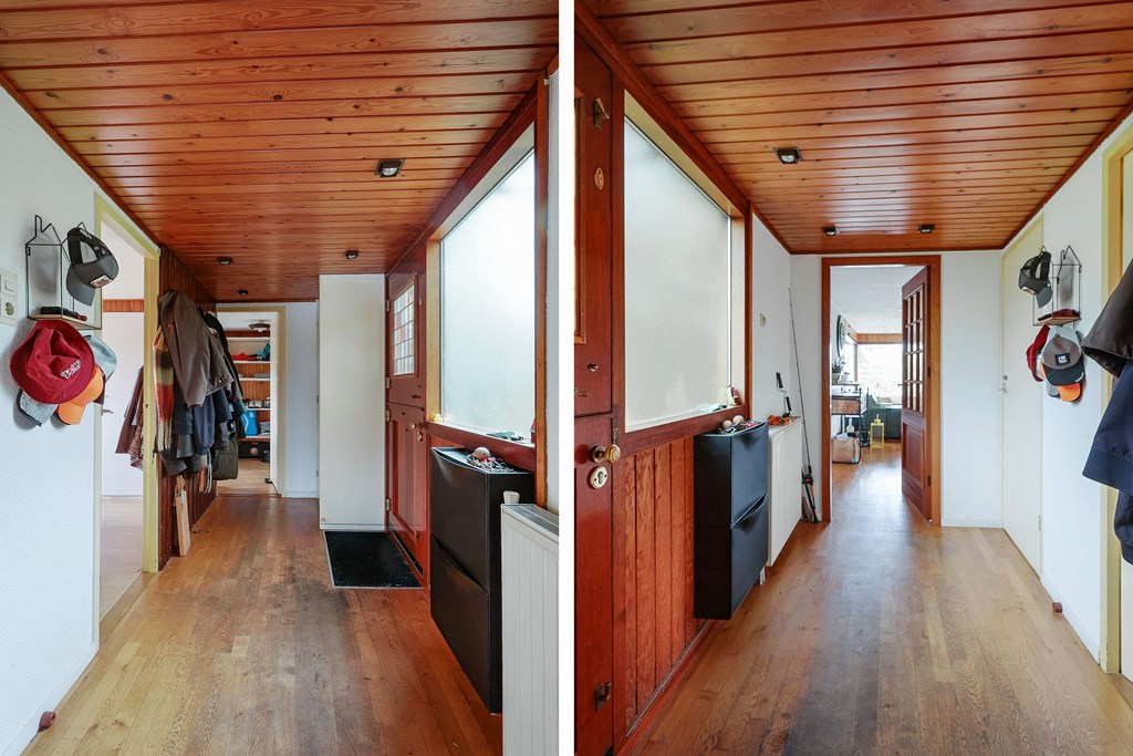 De voordeur bevindt zich op ± 3,20 meter vanaf rechts. Links van de voordeur bevindt zich de woonkamer.