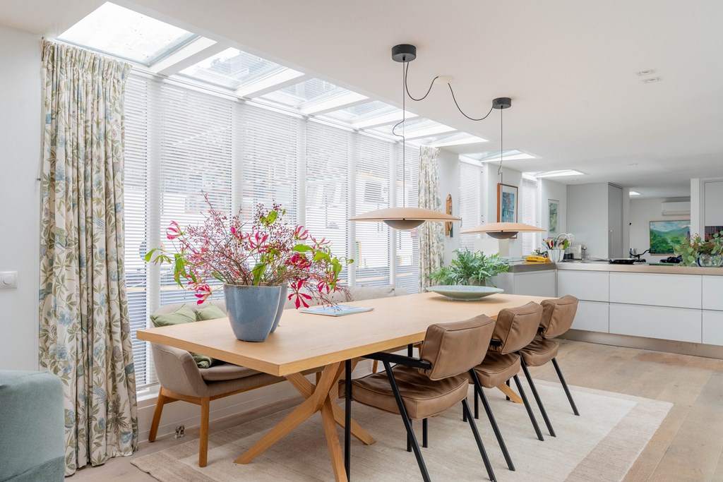 Eetkamergedeelte heeft plaats voor een lange eettafel.