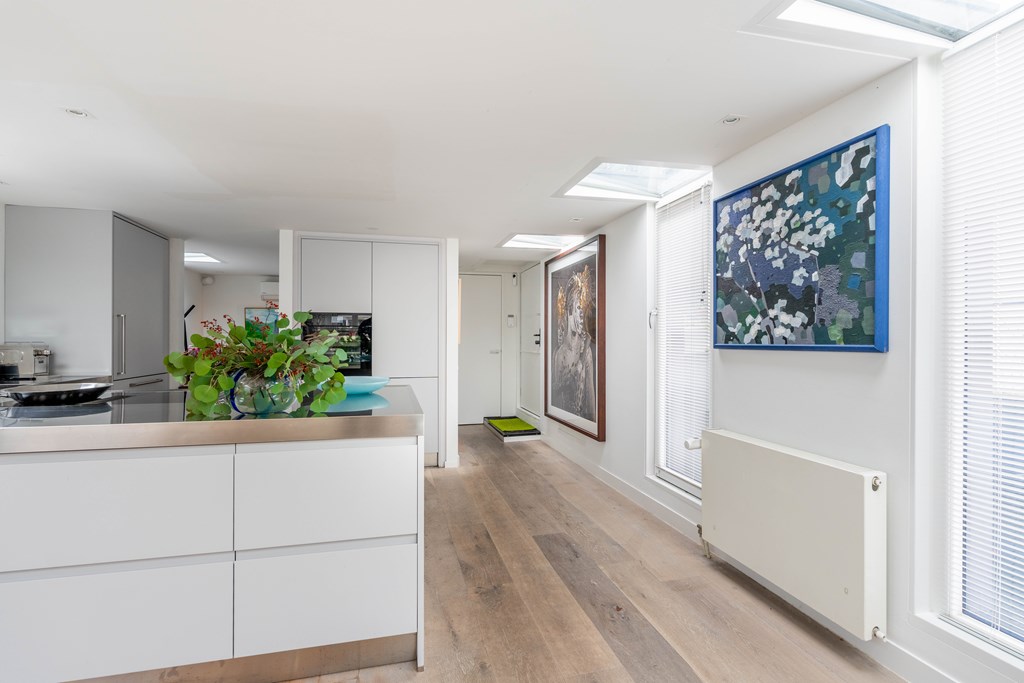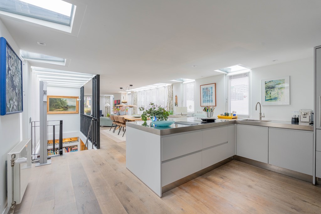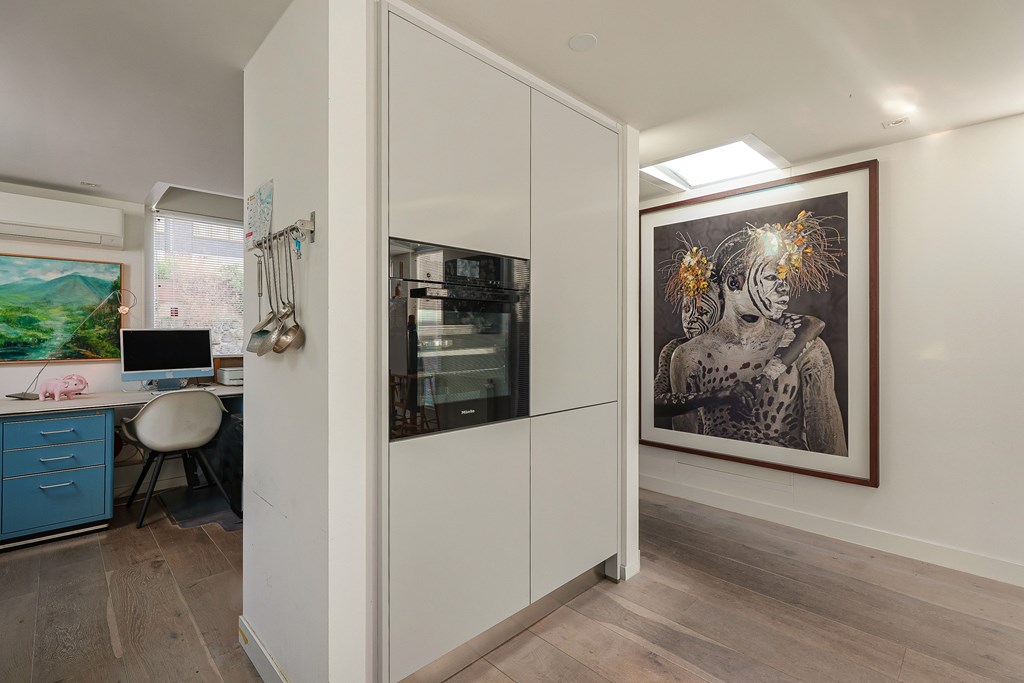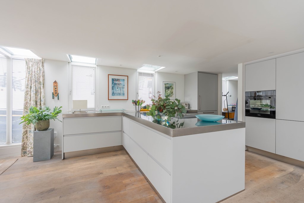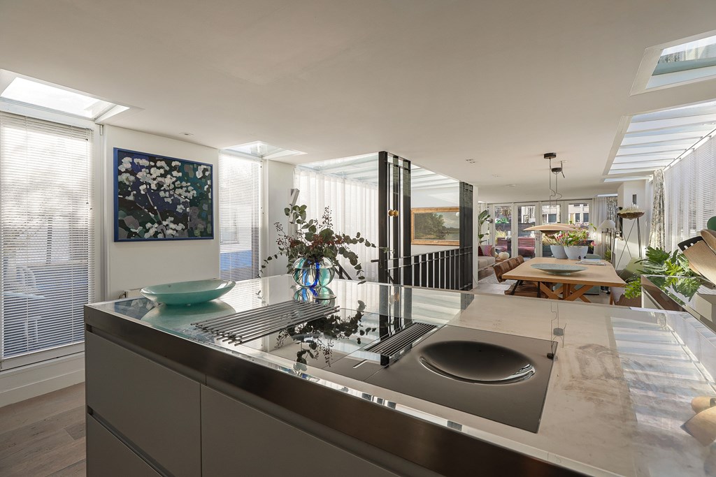 Fraaie design-keuken (“Van Boven”) met alle denkbare luxe, zoals een quooker combi/cube (met bruiswater), oven inclusief stoomoven, speciale wokpan-uitsparing op kookplaat en extra brede koel/vriescombi (90cm breed) met ijsklontjesmaker.