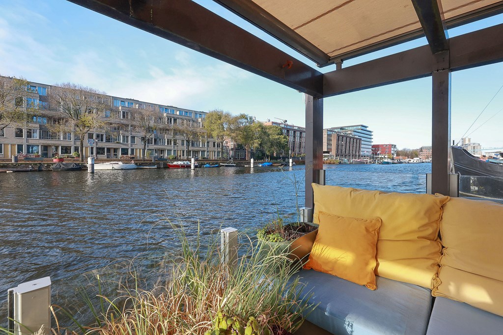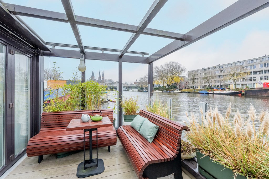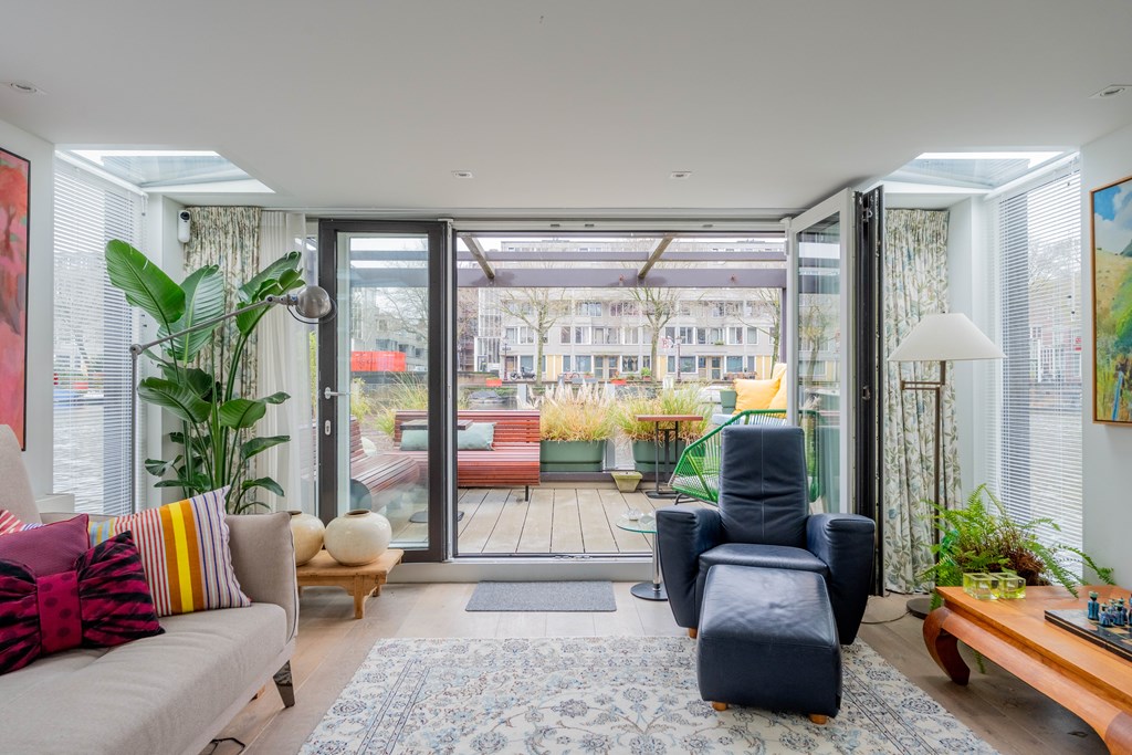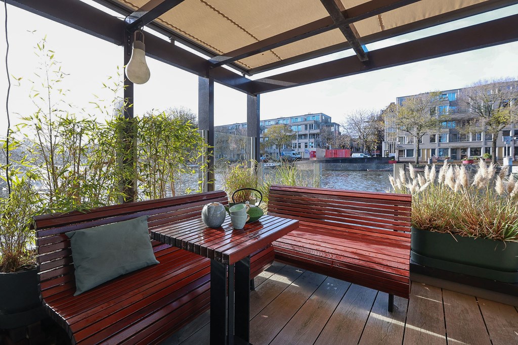 De riante woonkamer biedt, via de openslaande deuren, toegang tot het inpandige, op het zuiden gelegen terras. Windvrij en vrij uitzicht over het water dankzij de glazen omheining. Het terras is met zorg en aandacht voor detail aangelegd: een elektrisch werkend zonnescherm met wind- en regendetectie. In de omheining bevindt zich een deurtje voor het instappen in een sloep.