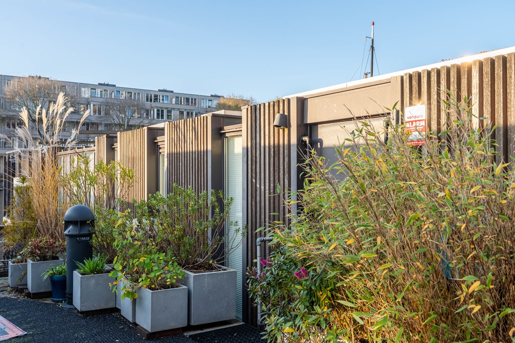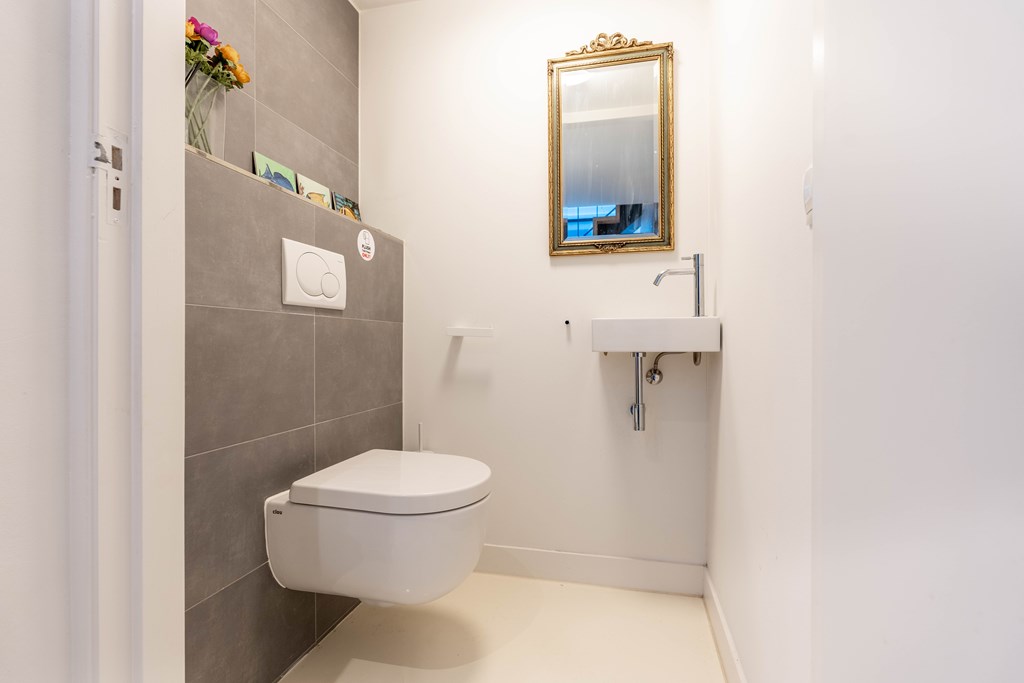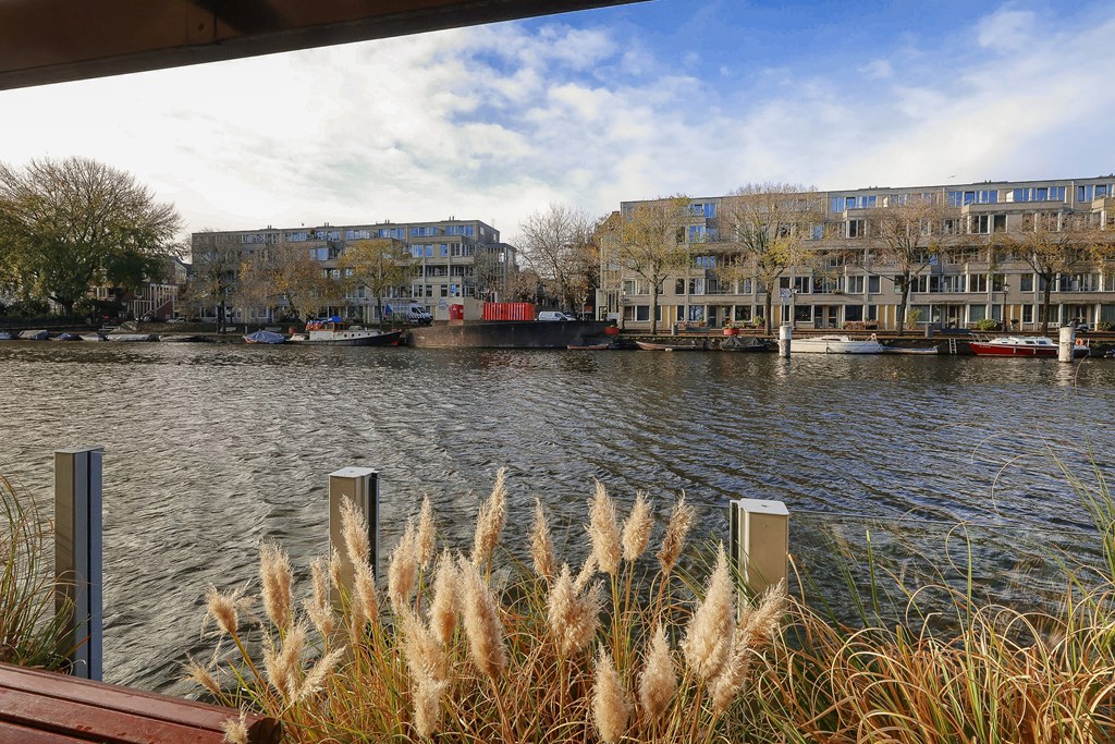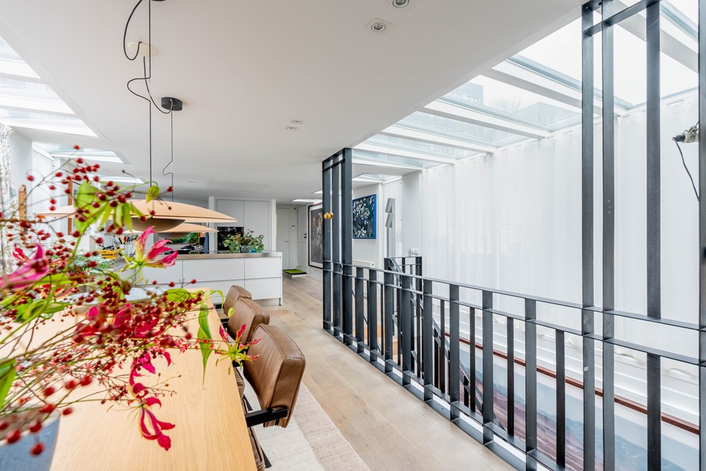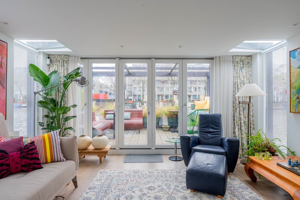 De riante woonkamer biedt, via de openslaande deuren, toegang tot het inpandige, op het zuiden gelegen terras. Windvrij en vrij uitzicht over het water dankzij de glazen omheining. Het terras is met zorg en aandacht voor detail aangelegd: een elektrisch werkend zonnescherm met wind- en regendetectie. In de omheining bevindt zich een deurtje voor het instappen in een sloep.