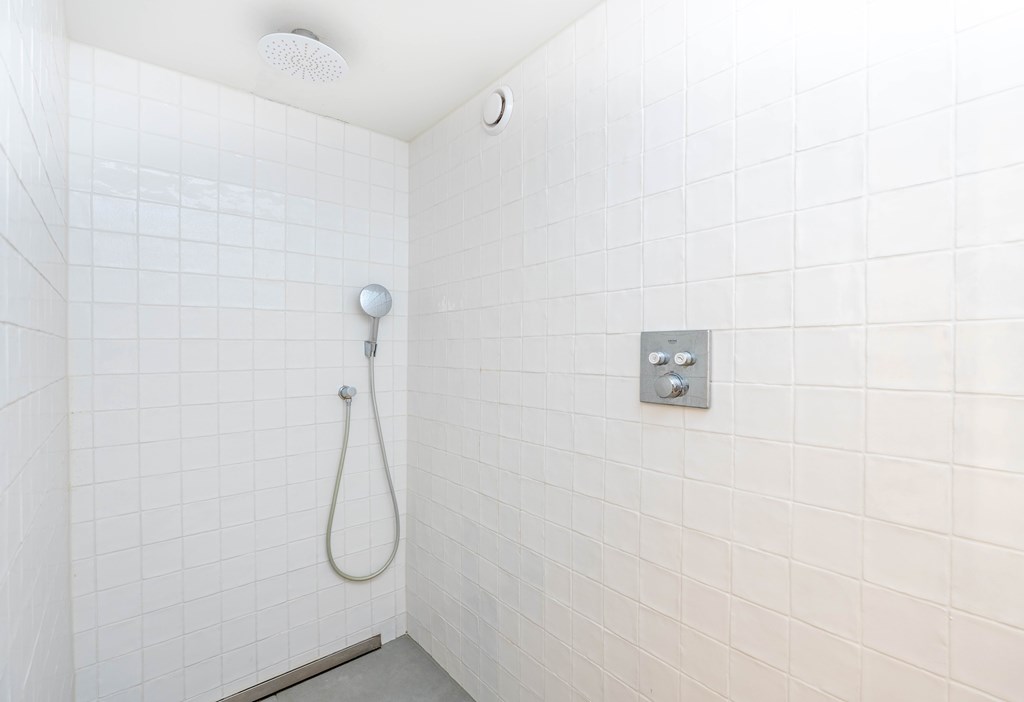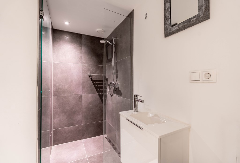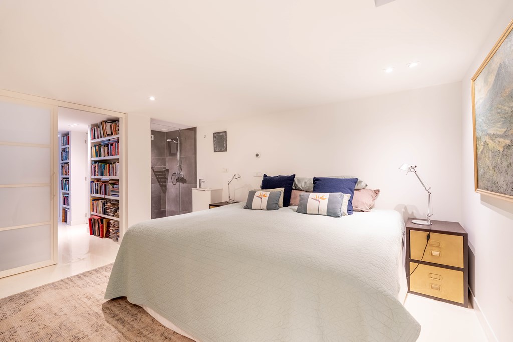 Tweede ruime slaapkamer met inloopdouche, wastafelmeubel en kastenwand.