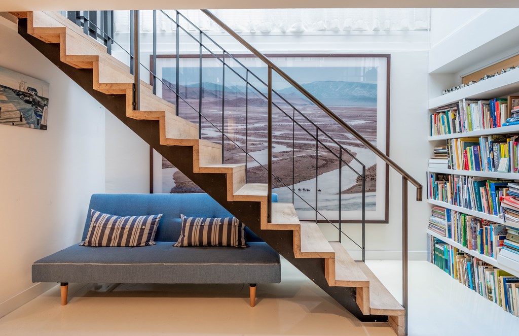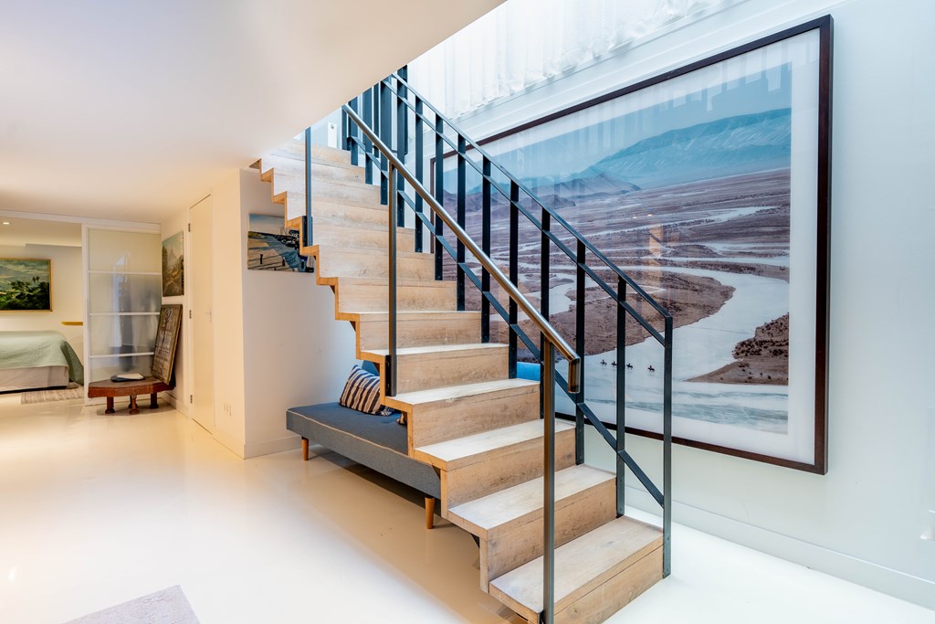 Via een strak vormgegeven trap wordt de benedenverdieping bereikt, volledig voorzien van een doorlopende gietvloer.