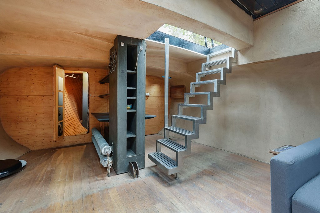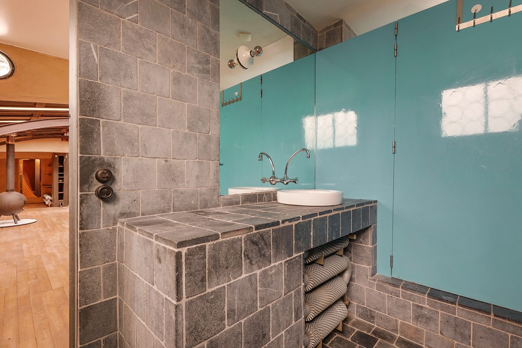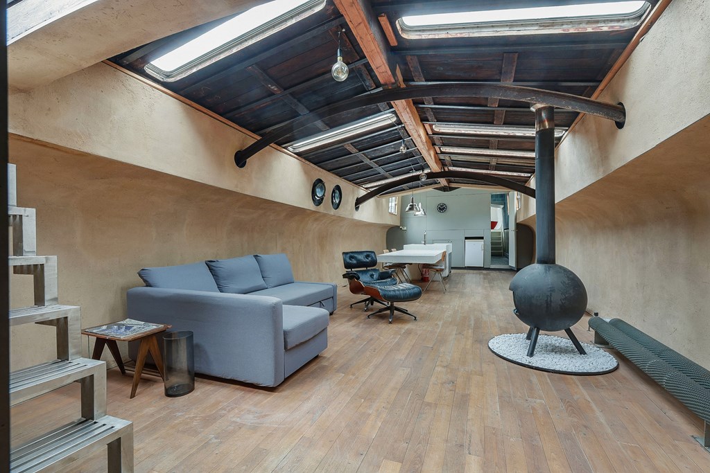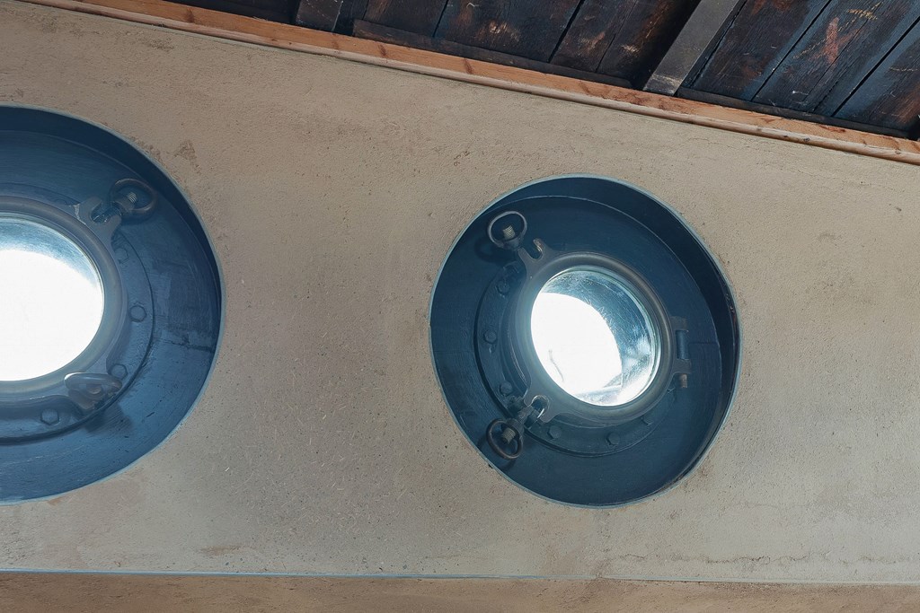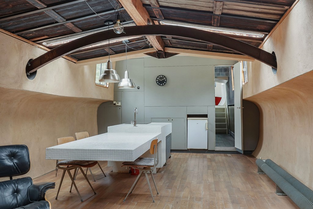De woonkamer heeft een lemen wandafwerking en plafond wat een isolerende werking heeft en zorgt voor een modern karakter en originele gebogen metalen dakbalken zichtbaar over de volle breedte.