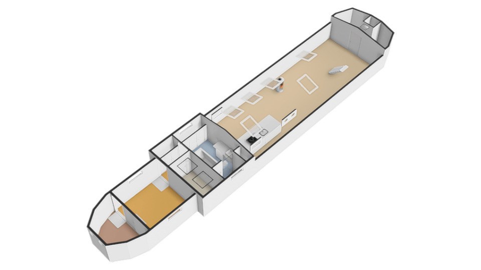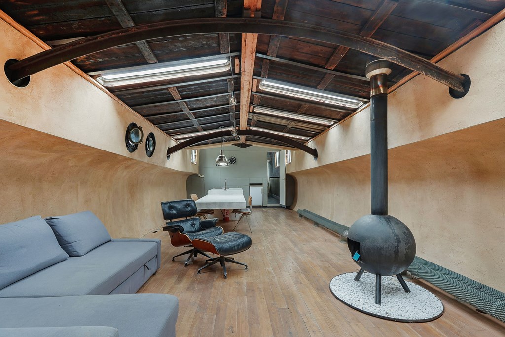 Riante woonkamer met houtkachel in voormalig laadruim, inclusief keukeneiland met een verlengd werkblad als eettafel.