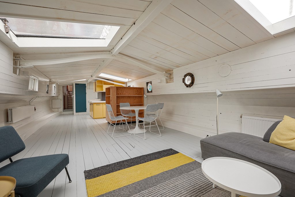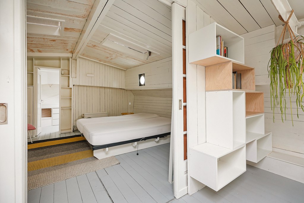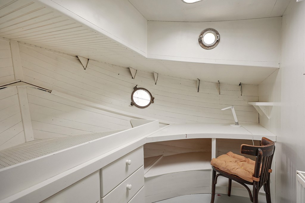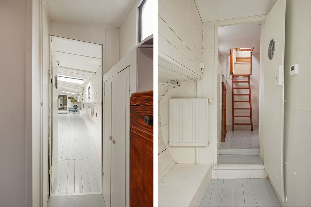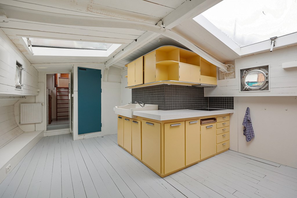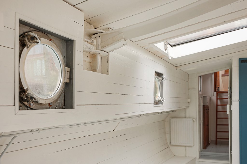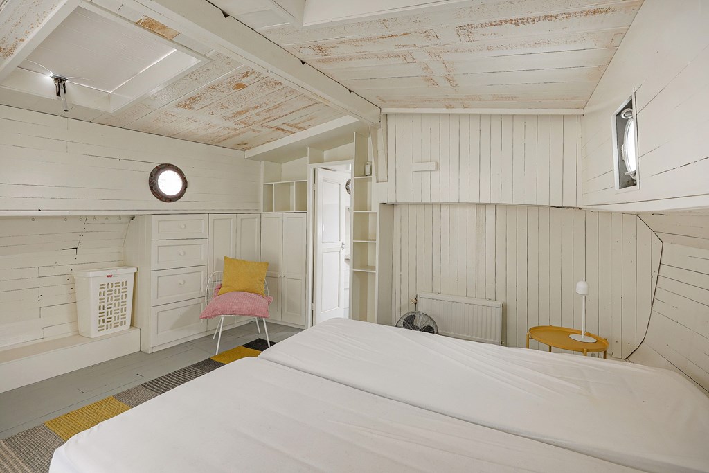 Entree via de stuurhut, trap naar hal met toegang tot een kleine slaapkamer met een vast bed en wastafel, zeer ruime en lichte woonkamer door het gebruik van diverse dakramen en compacte open keuken, badkamer met toilet, wastafelmeubel en douchecabine. In het verlengde van de woonkamer ligt de grote slaapkamer voorzien van 2 dakramen en een wastafel, achter de grote slaapkamer ligt nog een ruimte te gebruiken als werkkamer.