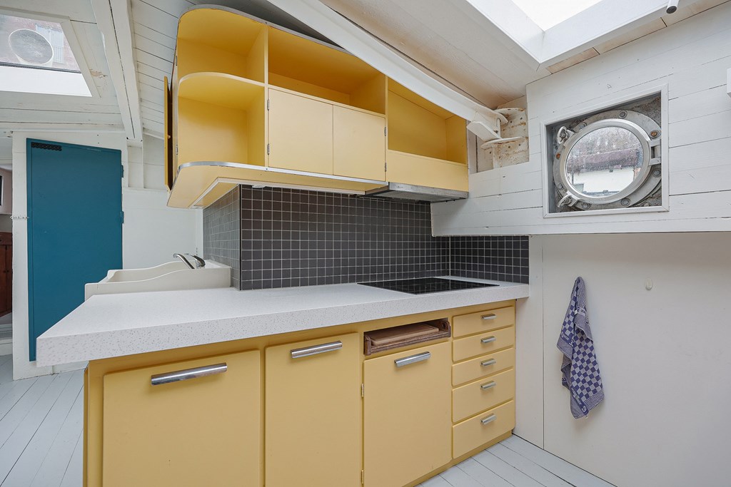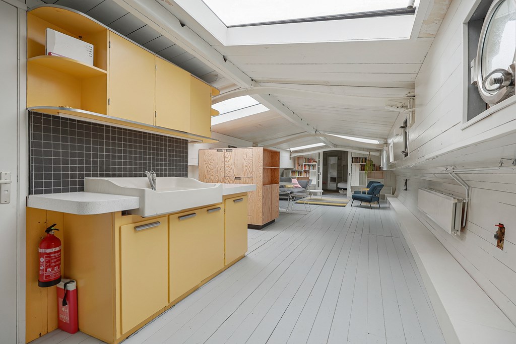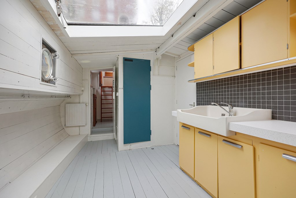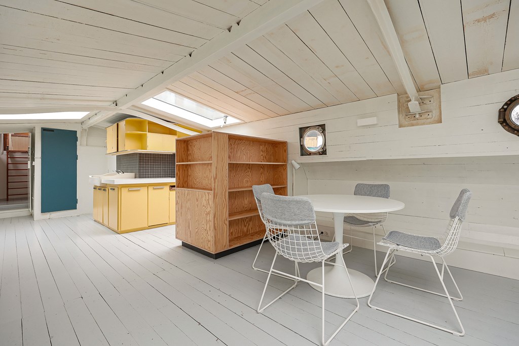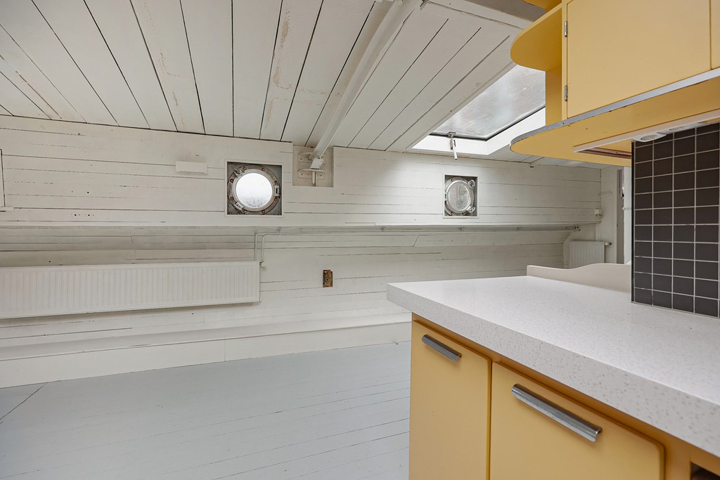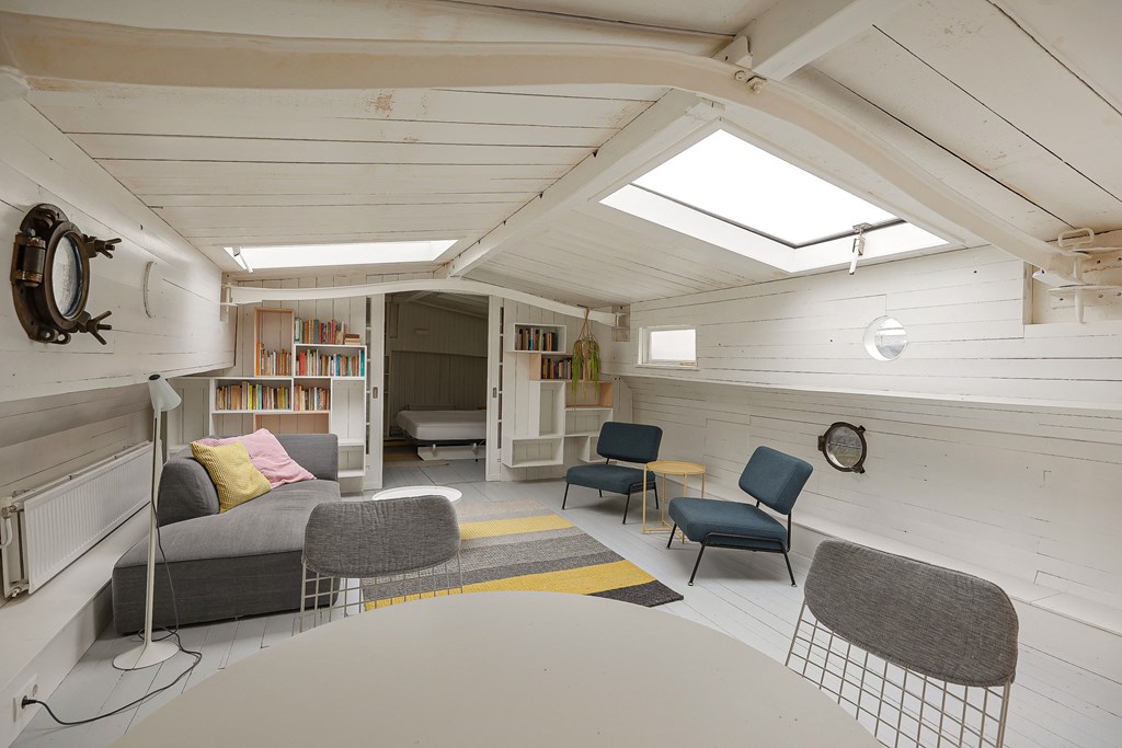 Entree via de stuurhut, trap naar hal met toegang tot een kleine slaapkamer met een vast bed en wastafel, zeer ruime en lichte woonkamer door het gebruik van diverse dakramen en compacte open keuken, badkamer met toilet, wastafelmeubel en douchecabine. In het verlengde van de woonkamer ligt de grote slaapkamer voorzien van 2 dakramen en een wastafel, achter de grote slaapkamer ligt nog een ruimte te gebruiken als werkkamer.
