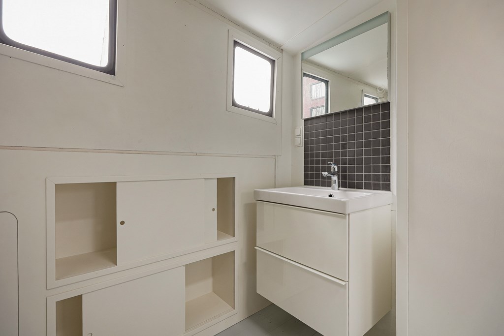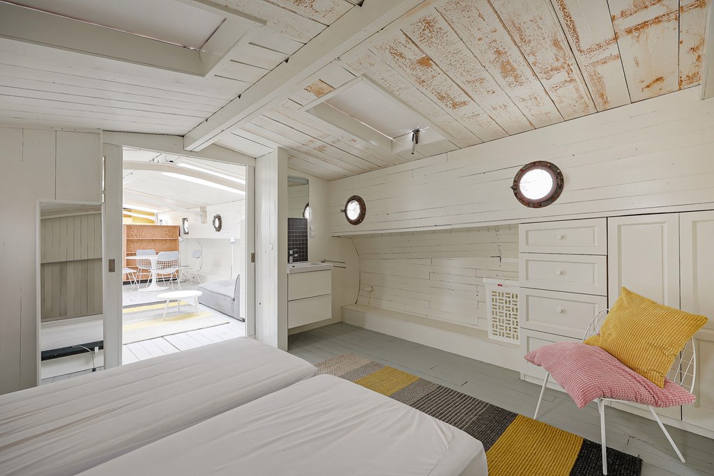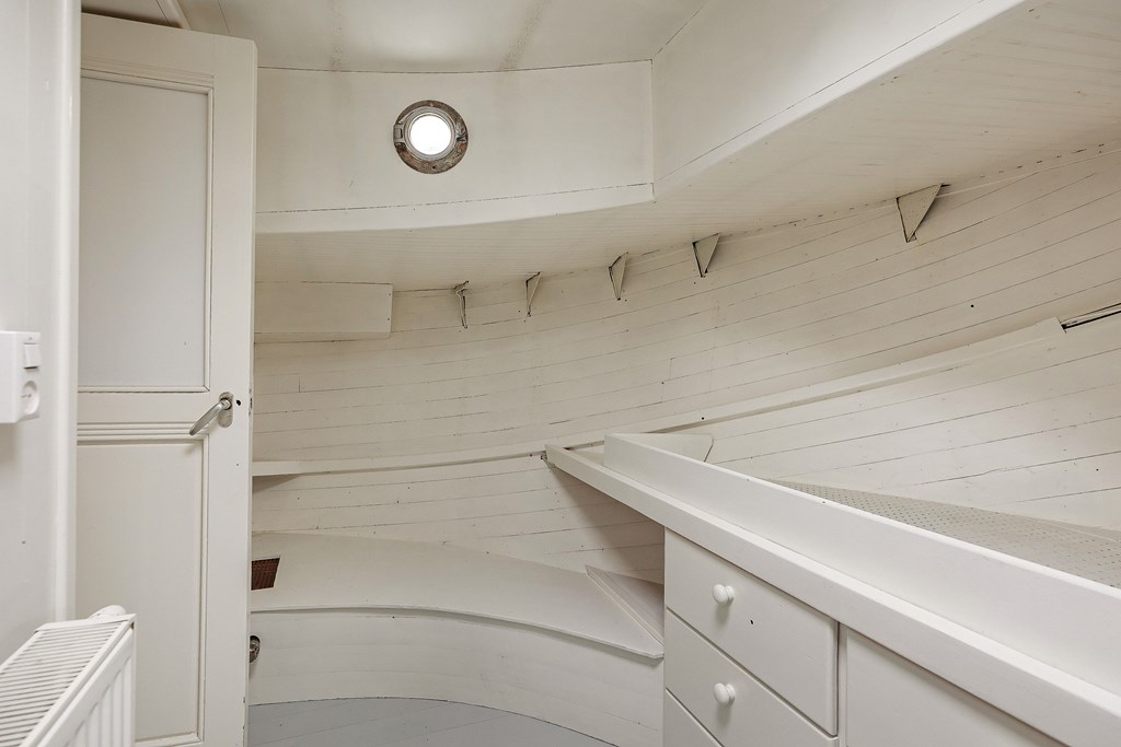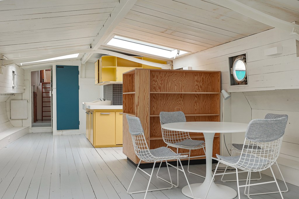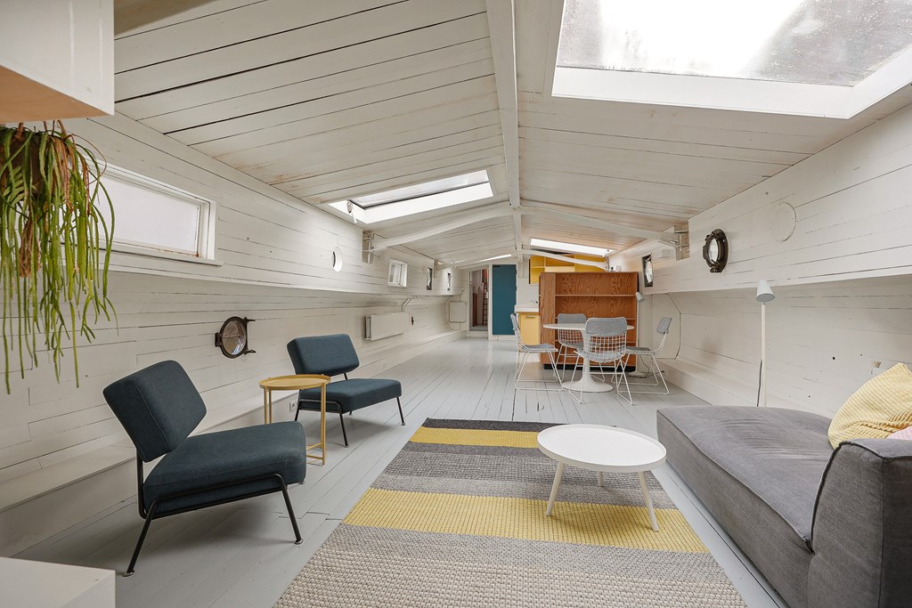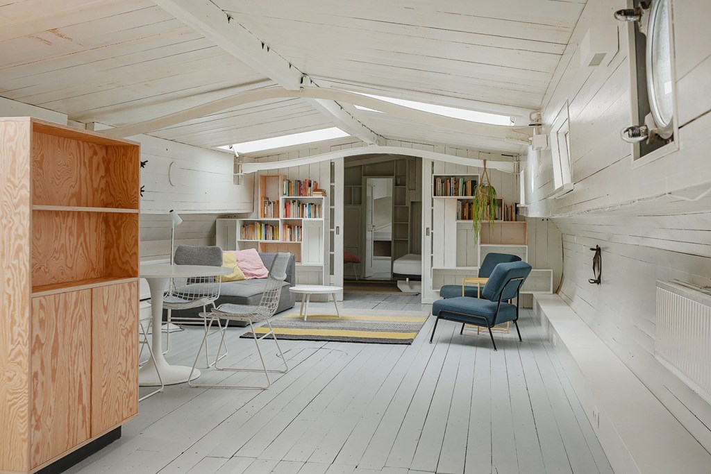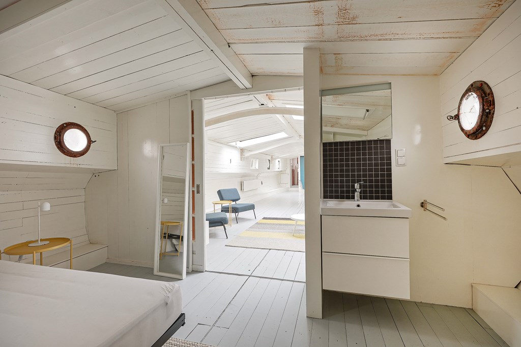 Entree via de stuurhut, trap naar hal met toegang tot een kleine slaapkamer met een vast bed en wastafel, zeer ruime en lichte woonkamer door het gebruik van diverse dakramen en compacte open keuken, badkamer met toilet, wastafelmeubel en douchecabine. In het verlengde van de woonkamer ligt de grote slaapkamer voorzien van 2 dakramen en een wastafel, achter de grote slaapkamer ligt nog een ruimte te gebruiken als werkkamer.