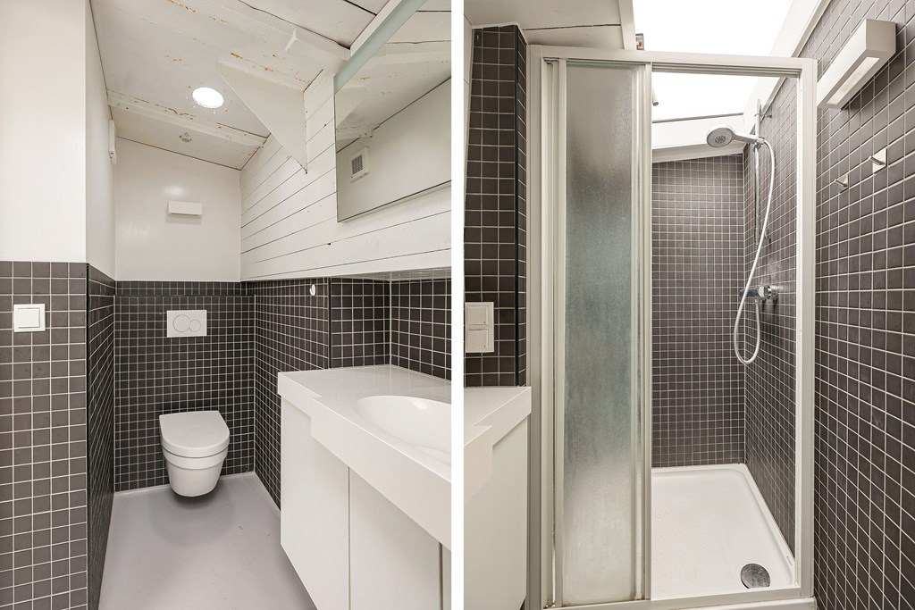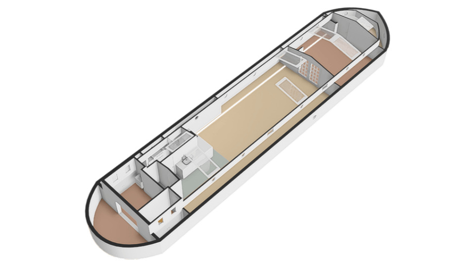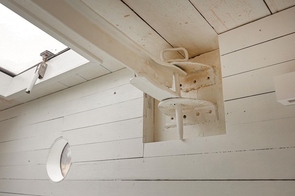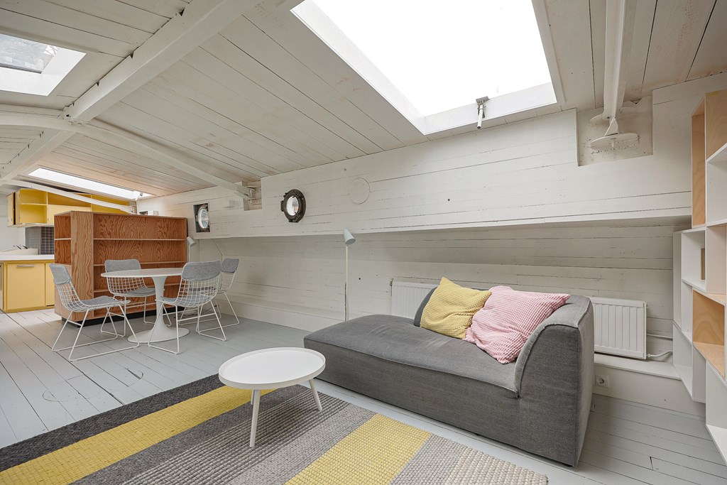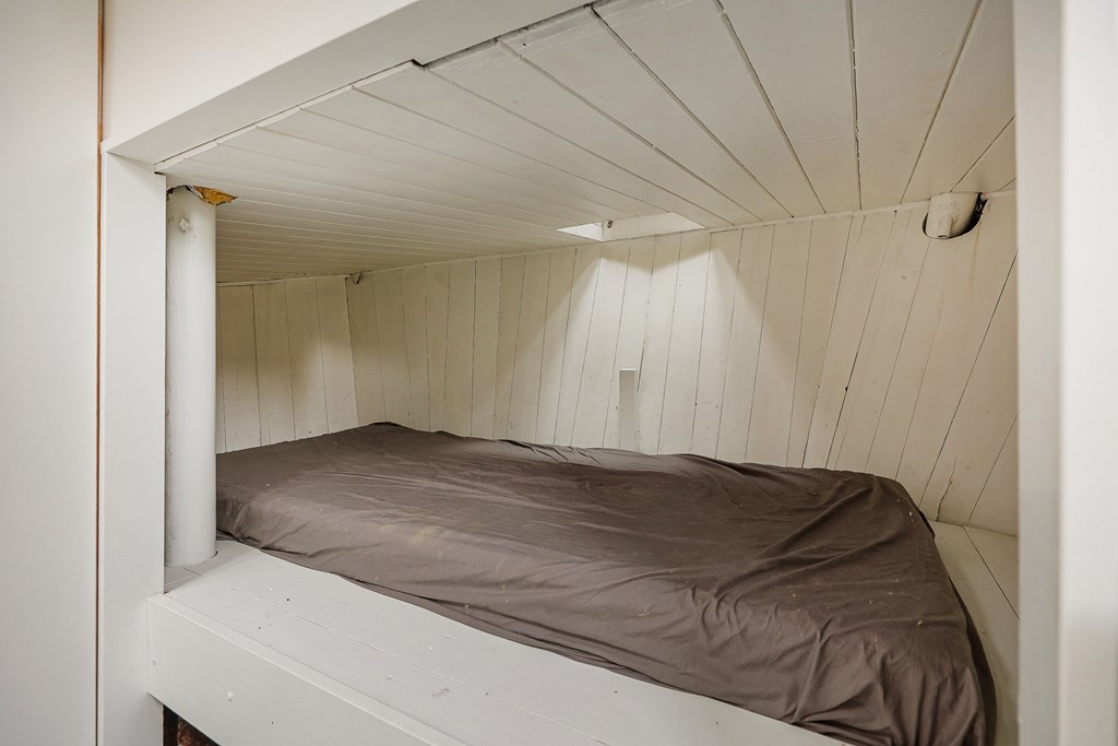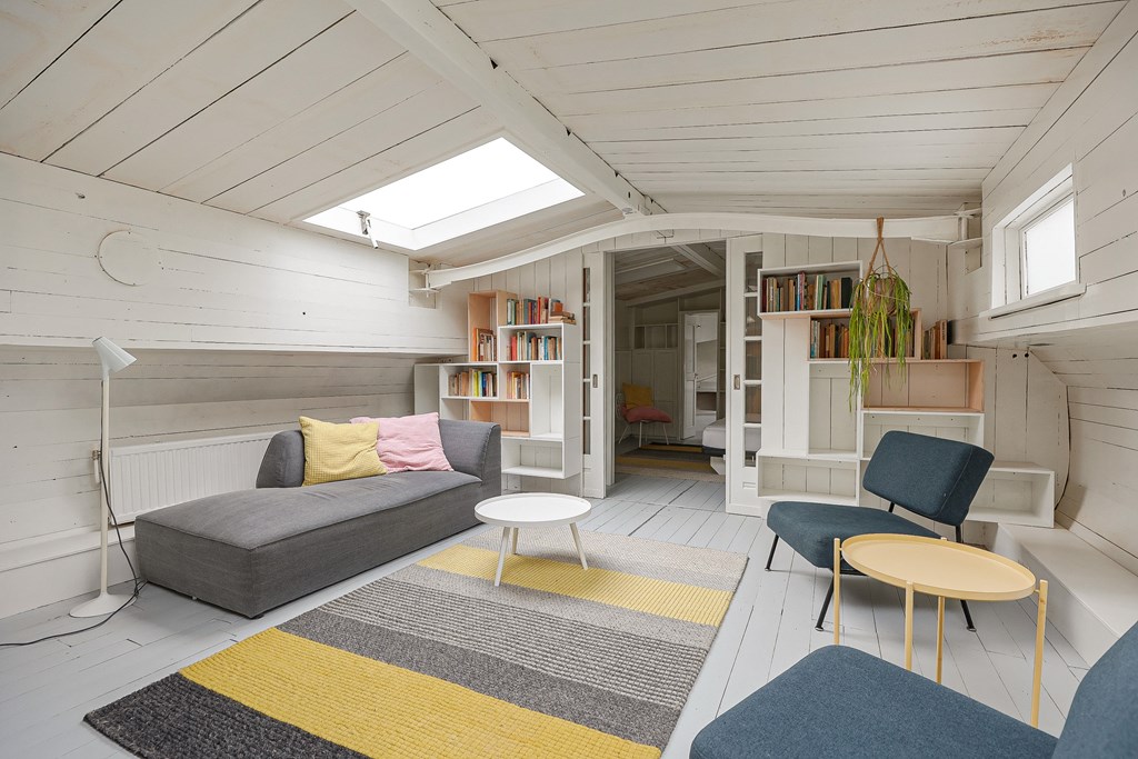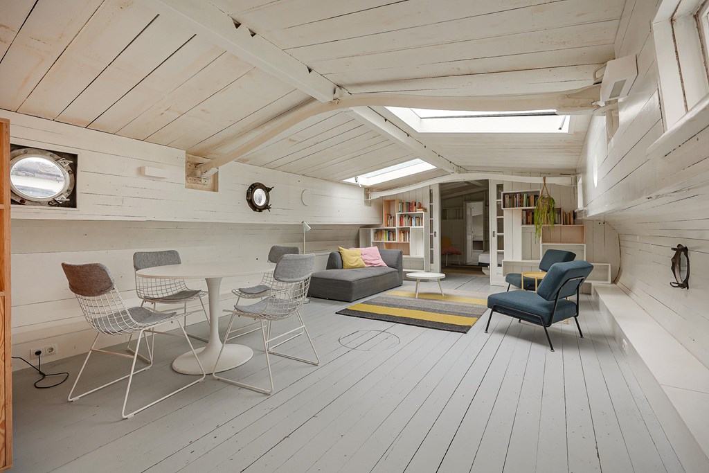 Entree via de stuurhut, trap naar hal met toegang tot een kleine slaapkamer met een vast bed en wastafel, zeer ruime en lichte woonkamer door het gebruik van diverse dakramen en compacte open keuken, badkamer met toilet, wastafelmeubel en douchecabine. In het verlengde van de woonkamer ligt de grote slaapkamer voorzien van 2 dakramen en een wastafel, achter de grote slaapkamer ligt nog een ruimte te gebruiken als werkkamer.