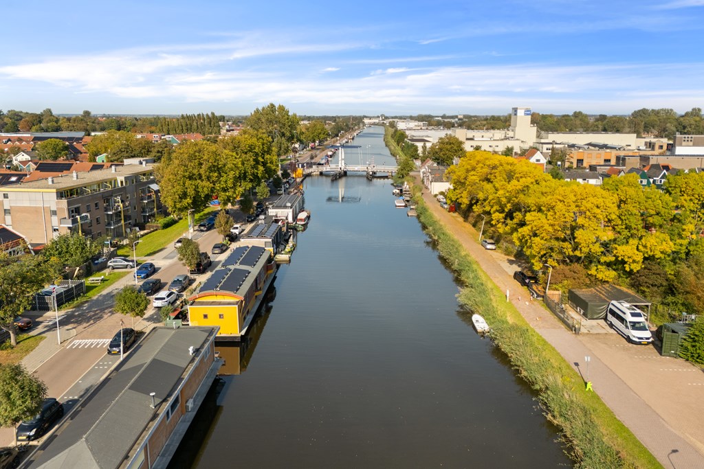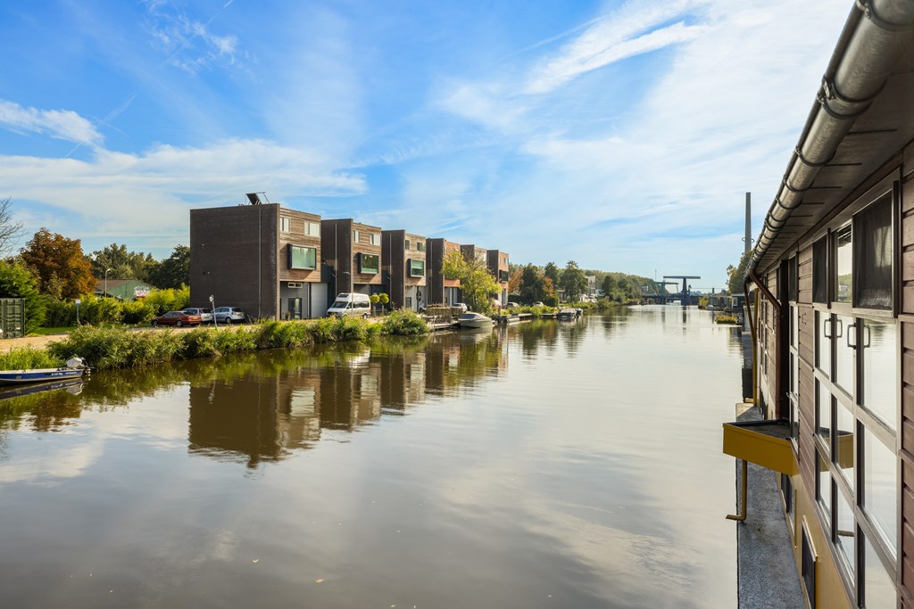 Boven: Royale woonkamer met open keuken met diverse inbouwapparatuur en werkhoek, grenzend aan een leuk terras met uitzicht op de vaart.