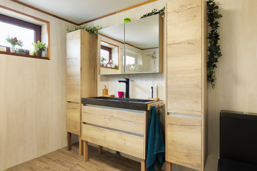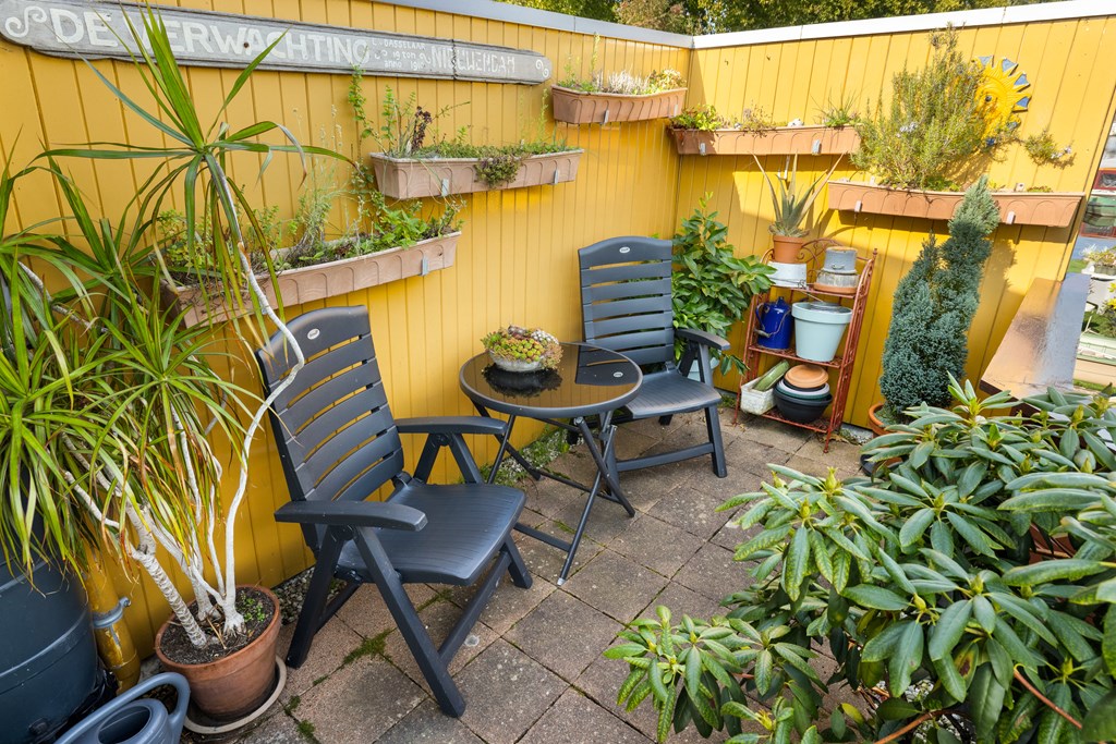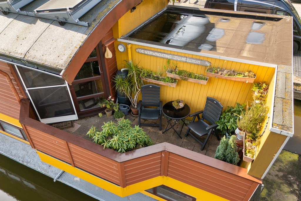 Tussen de wal en de woonark ligt nog een vlonderterras met schutting waar u lekker beschut kunt zitten.