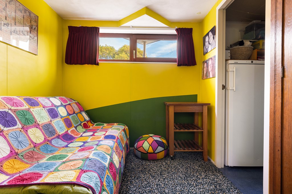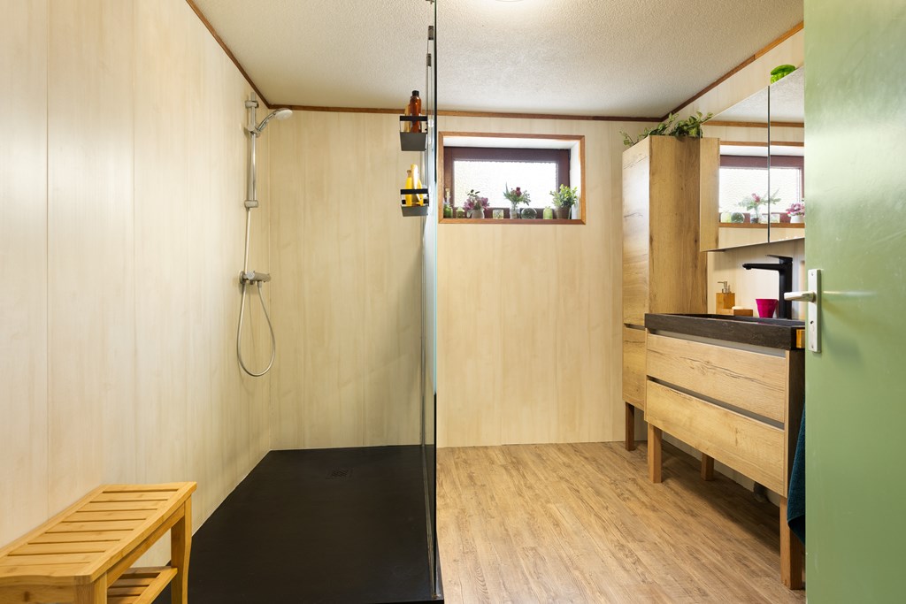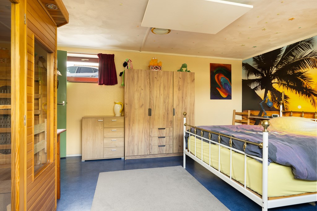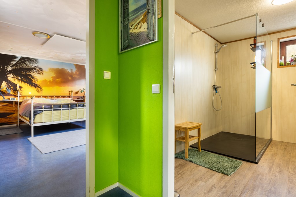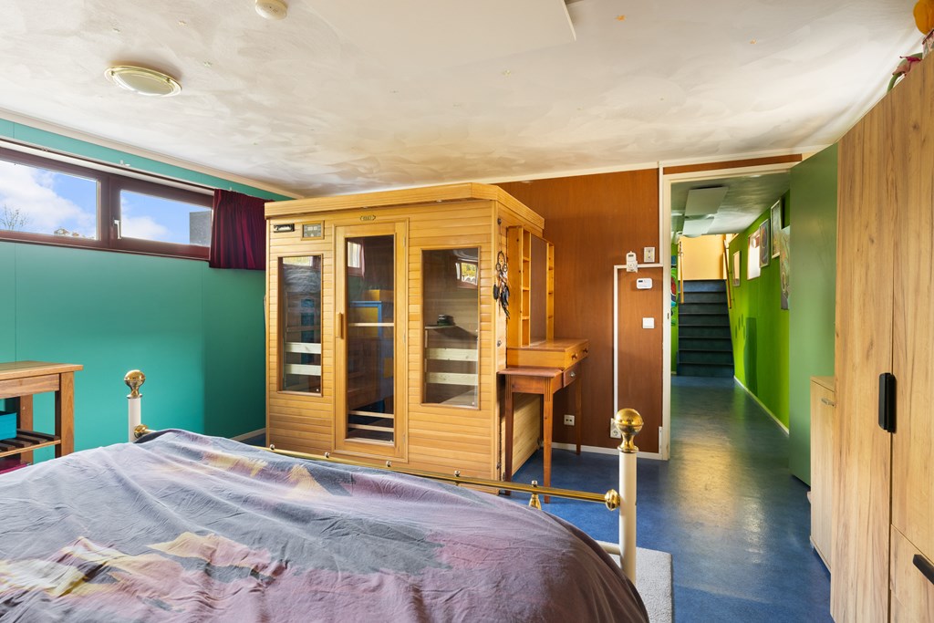 Beneden: Hier bevinden zich een kleine slaapkamer, de badkamer met toilet, inloopdouche en wastafelmeubel, een ruime slaapkamer met inloopkast en infraroodsauna (2009).