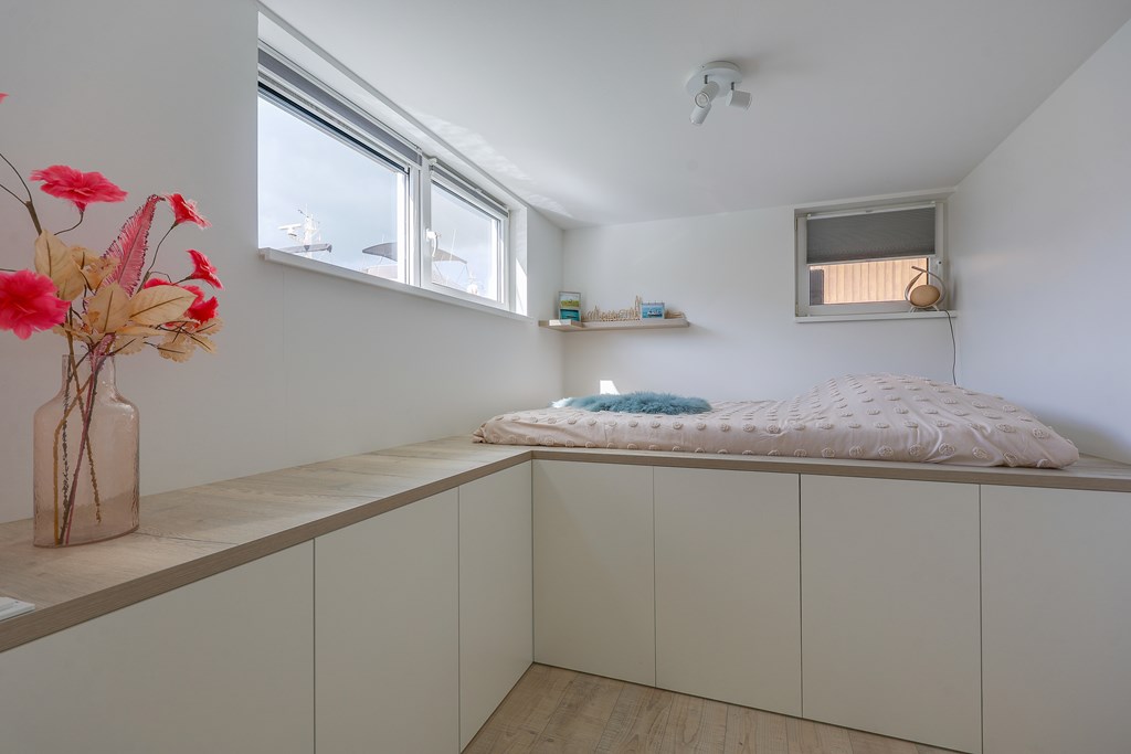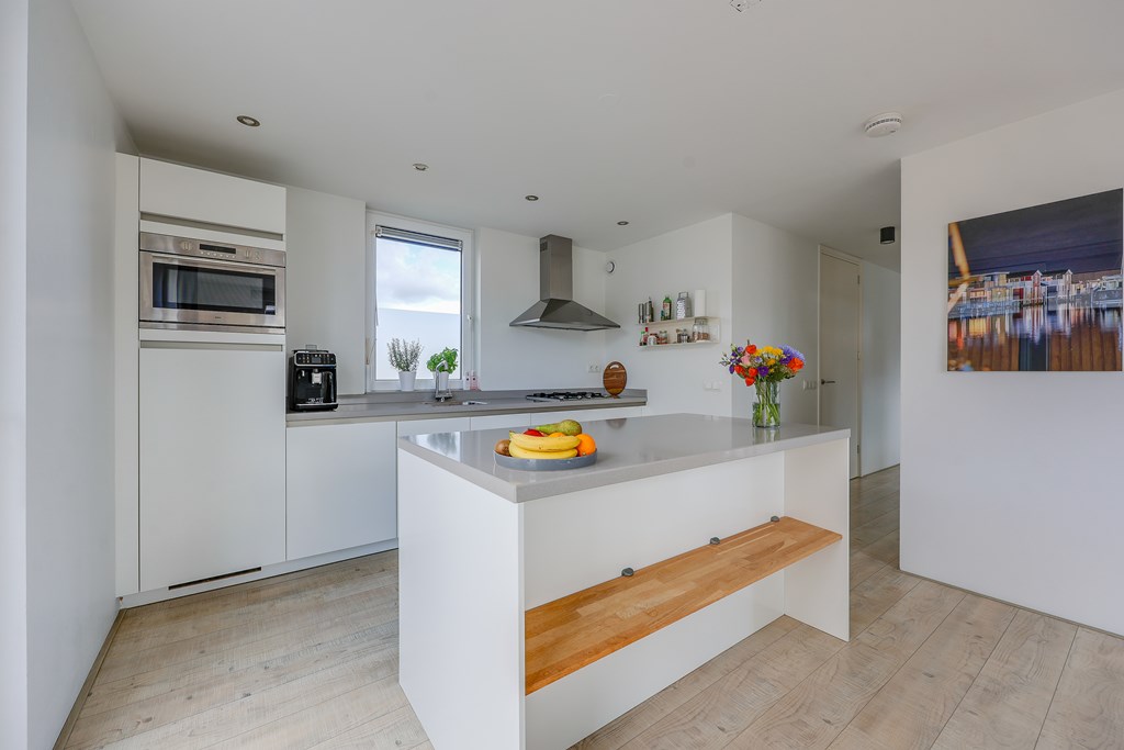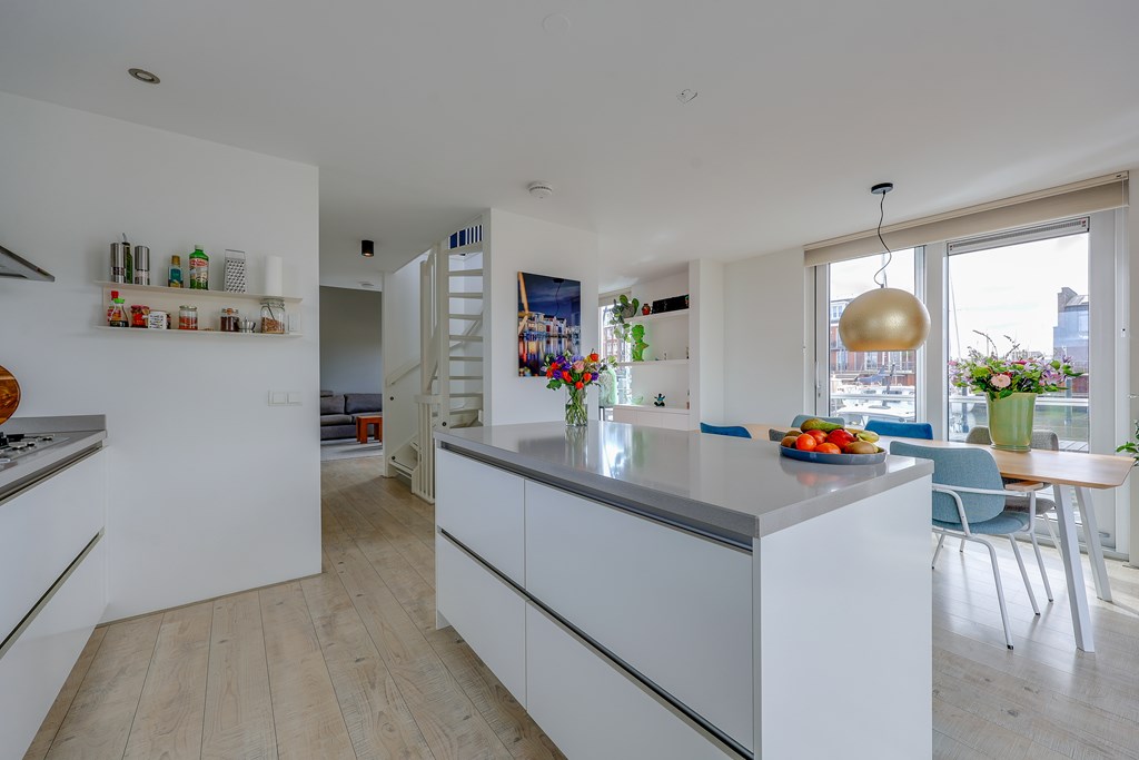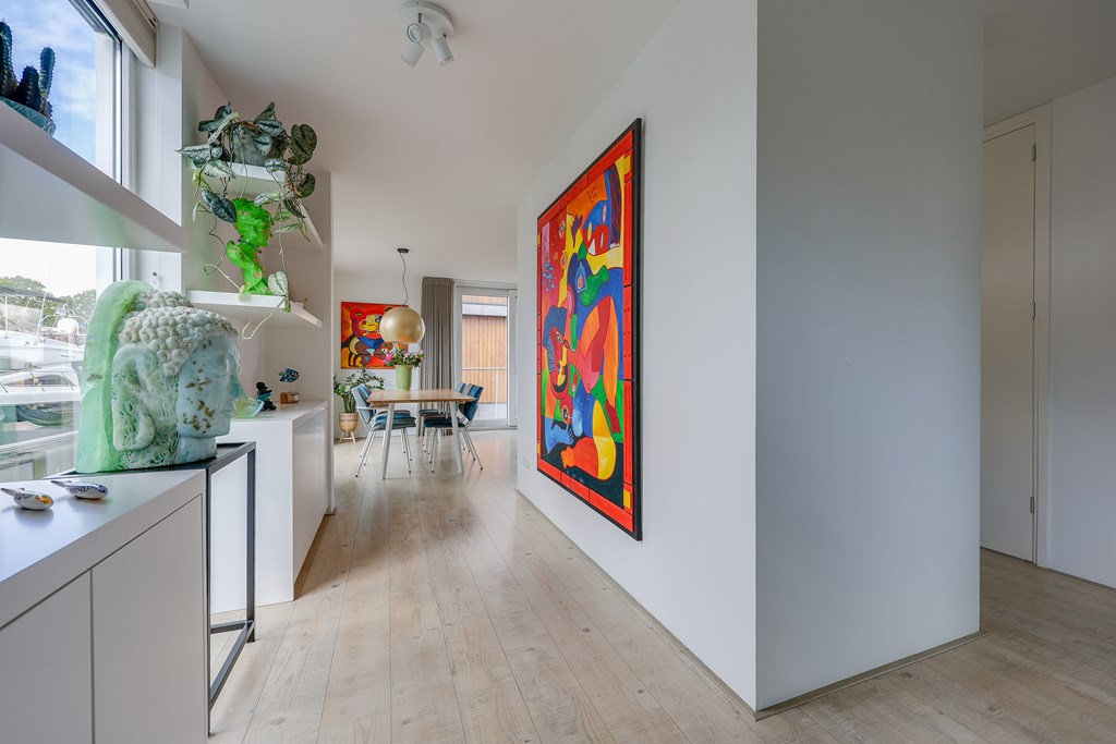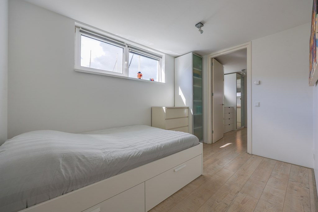 De woonkamer en keuken voelen licht aan door de vele raampartijen met uitzicht over het water. Drie ruime slaapkamers en een extra kamer die ingericht kan worden als een kantoor/aterlier of logeerplek. Een badkamer smaakvol afgewerkt en volledig uitgerust met ligbad, ruime inloopdouche en dubbele wastafel. Kortom een instapklare, moderne waterwoning met een woonoppervlakte van ± 139 m2.